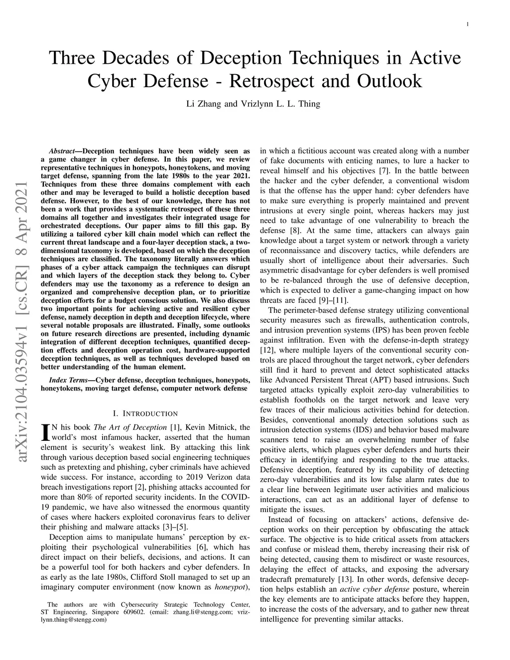 Deception techniques have been widely seen as a game changer in cyber defense. In this paper, we review representative techniques in honeypots, honeytokens, and moving target defense, spanning from the late 1980s to the year 2021. Techniques from these three domains complement with each other and may be leveraged to build a holistic deception based defense. However, to the best of our knowledge, there has not been a work that provides a systematic retrospect of these three domains all together and investigates their integrated usage for orchestrated deceptions. Our paper aims to fill this gap. By utilizing a tailored cyber kill chain model which can reflect the current threat landscape and a four-layer deception stack, a two-dimensional taxonomy is developed, based on which the deception techniques are classified. The taxonomy literally answers which phases of a cyber attack campaign the techniques can disrupt and which layers of the deception stack they belong to. Cyber defenders may use the taxonomy as a reference to design an organized and comprehensive deception plan, or to prioritize deception efforts for a budget conscious solution. We also discuss two important points for achieving active and resilient cyber defense, namely deception in depth and deception lifecycle, where several notable proposals are illustrated. Finally, some outlooks on future research directions are presented, including dynamic integration of different deception techniques, quantified deception effects and deception operation cost, hardware-supported deception techniques, as well as techniques developed based on better understanding of the human element.