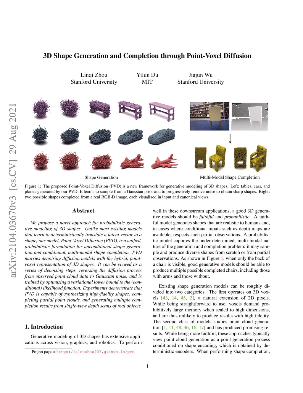 We propose a novel approach for probabilistic generative modeling of 3D shapes. Unlike most existing models that learn to deterministically translate a latent vector to a shape, our model, Point-Voxel Diffusion (PVD), is a unified, probabilistic formulation for unconditional shape generation and conditional, multi-modal shape completion. PVD marries denoising diffusion models with the hybrid, point-voxel representation of 3D shapes. It can be viewed as a series of denoising steps, reversing the diffusion process from observed point cloud data to Gaussian noise, and is trained by optimizing a variational lower bound to the (conditional) likelihood function. Experiments demonstrate that PVD is capable of synthesizing high-fidelity shapes, completing partial point clouds, and generating multiple completion results from single-view depth scans of real objects.