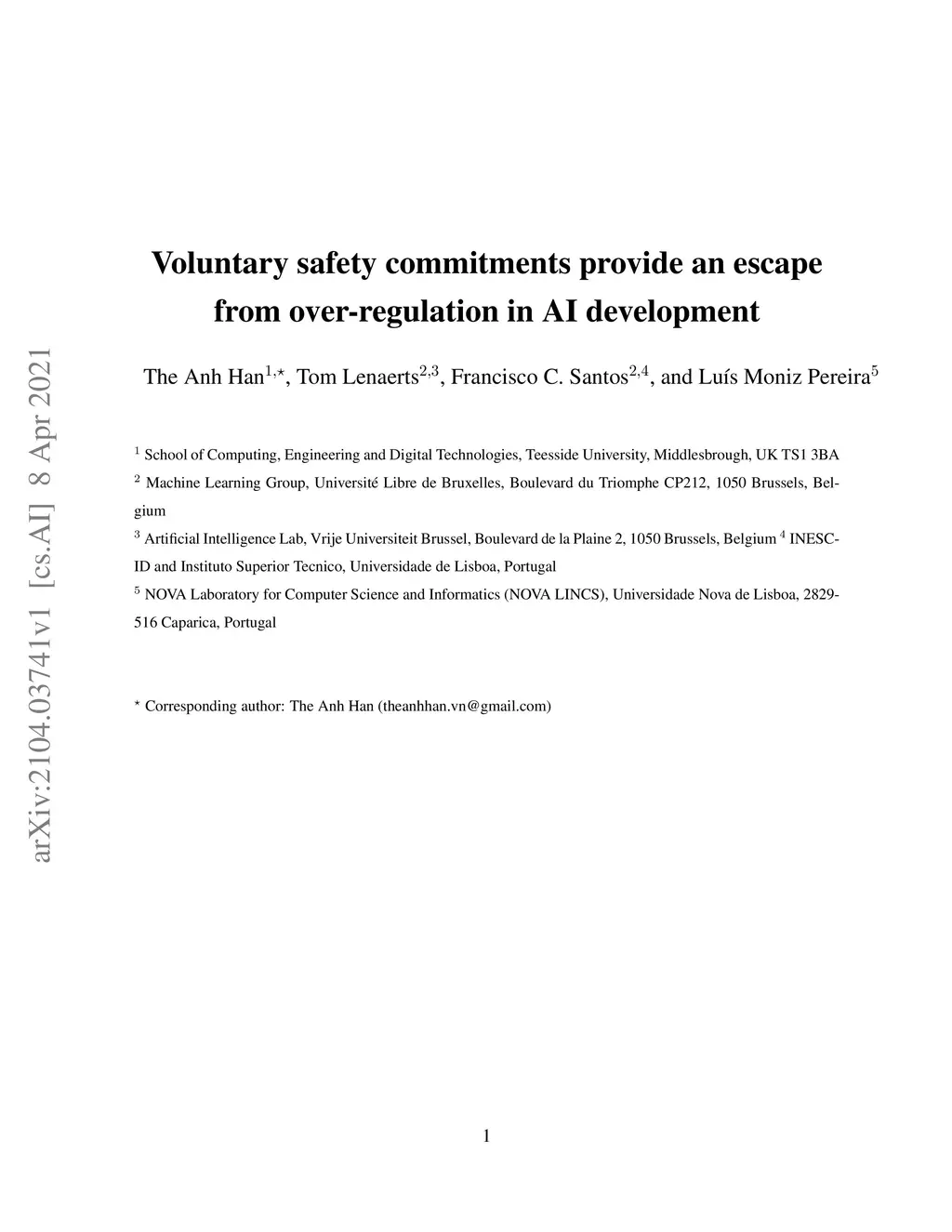 With the introduction of Artificial Intelligence (AI) and related technologies in our daily lives, fear and anxiety about their misuse as well as the hidden biases in their creation have led to a demand for regulation to address such issues. Yet blindly regulating an innovation process that is not well understood, may stifle this process and reduce benefits that society may gain from the generated technology, even under the best intentions. In this paper, starting from a baseline model that captures the fundamental dynamics of a race for domain supremacy using AI technology, we demonstrate how socially unwanted outcomes may be produced when sanctioning is applied unconditionally to risk-taking, i.e. potentially unsafe, behaviours. As an alternative to resolve the detrimental effect of over-regulation, we propose a voluntary commitment approach wherein technologists have the freedom of choice between independently pursuing their course of actions or establishing binding agreements to act safely, with sanctioning of those that do not abide to what they pledged. Overall, this work reveals for the first time how voluntary commitments, with sanctions either by peers or an institution, leads to socially beneficial outcomes in all scenarios envisageable in a short-term race towards domain supremacy through AI technology. These results are directly relevant for the design of governance and regulatory policies that aim to ensure an ethical and responsible AI technology development process.