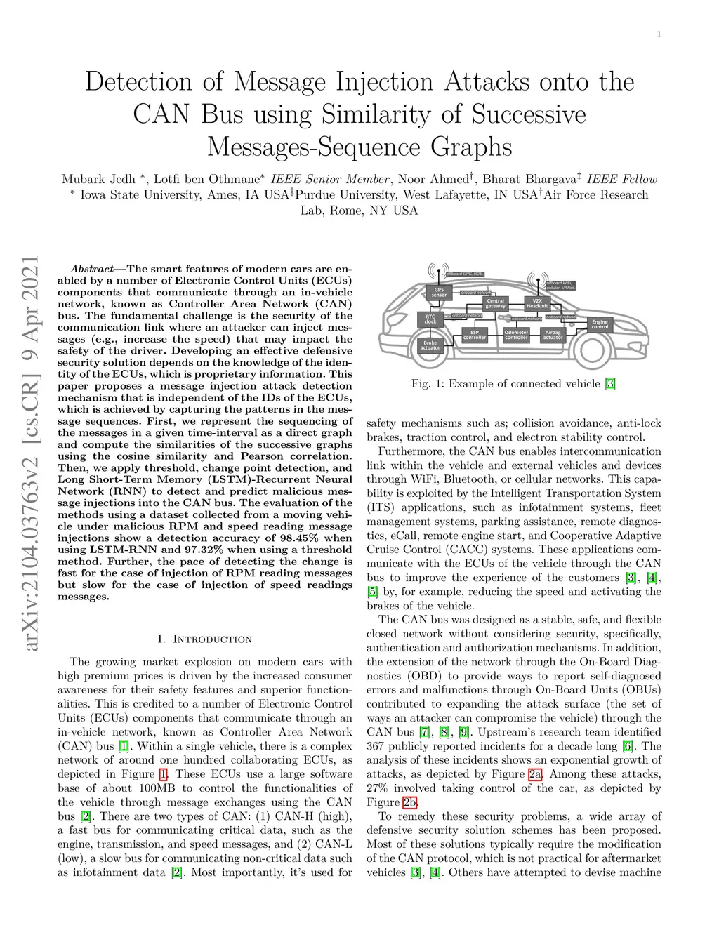 The smart features of modern cars are enabled by a number of Electronic Control Units (ECUs) components that communicate through an in-vehicle network, known as Controller Area Network (CAN) bus. The fundamental challenge is the security of the communication link where an attacker can inject messages (e.g., increase the speed) that may impact the safety of the driver. Developing an effective defensive security solution depends on the knowledge of the identity of the ECUs, which is proprietary information. This paper proposes a message injection attack detection mechanism that is independent of the IDs of the ECUs, which is achieved by capturing the patterns in the message sequences. First, we represent the sequencing ofther messages in a given time-interval as a direct graph and compute the similarities of the successive graphs using the cosine similarity and Pearson correlation. Then, we apply threshold, change point detection, and Long Short-Term Memory (LSTM)-Recurrent NeuralNetwork (RNN) to detect and predict malicious message injections into the CAN bus. The evaluation of the methods using a dataset collected from a moving vehicle under malicious RPM and speed reading message injections show a detection accuracy of 98.45% when using LSTM-RNN and 97.32% when using a threshold method. Further, the pace of detecting the change isfast for the case of injection of RPM reading messagesbut slow for the case of injection of speed readingsmessages.