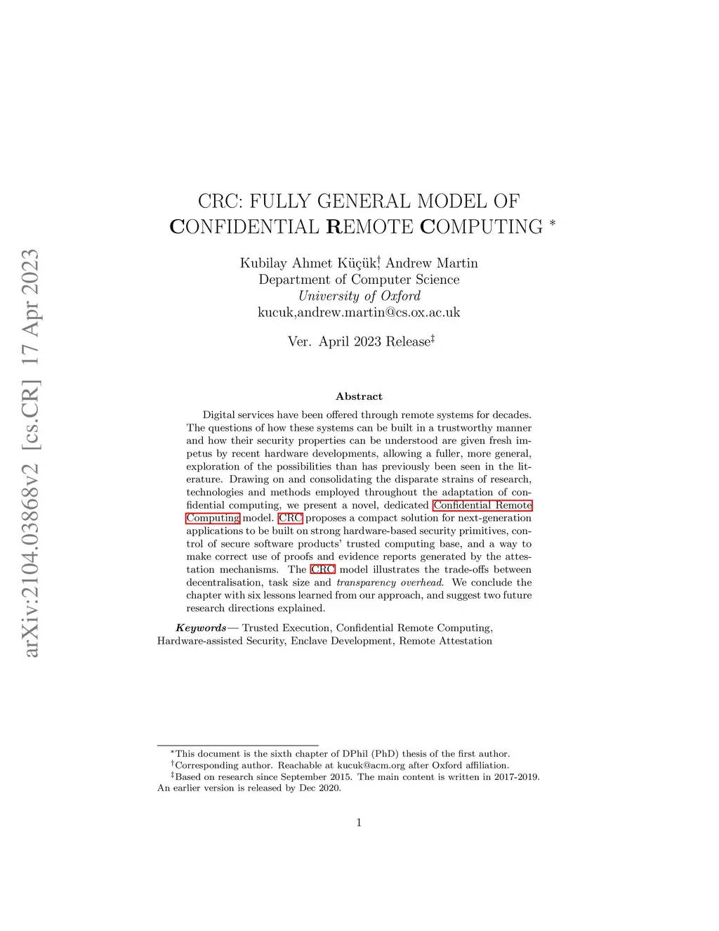 Digital services have been offered through remote systems for decades. The questions of how these systems can be built in a trustworthy manner and how their security properties can be understood are given fresh impetus by recent hardware developments, allowing a fuller, more general, exploration of the possibilities than has previously been seen in the literature. Drawing on and consolidating the disparate strains of research, technologies and methods employed throughout the adaptation of confidential computing, we present a novel, dedicated Confidential Remote Computing (CRC) model. CRC proposes a compact solution for next-generation applications to be built on strong hardware-based security primitives, control of secure software products' trusted computing base, and a way to make correct use of proofs and evidence reports generated by the attestation mechanisms. The CRC model illustrates the trade-offs between decentralisation, task size and transparency overhead. We conclude the paper with six lessons learned from our approach, and suggest two future research directions.