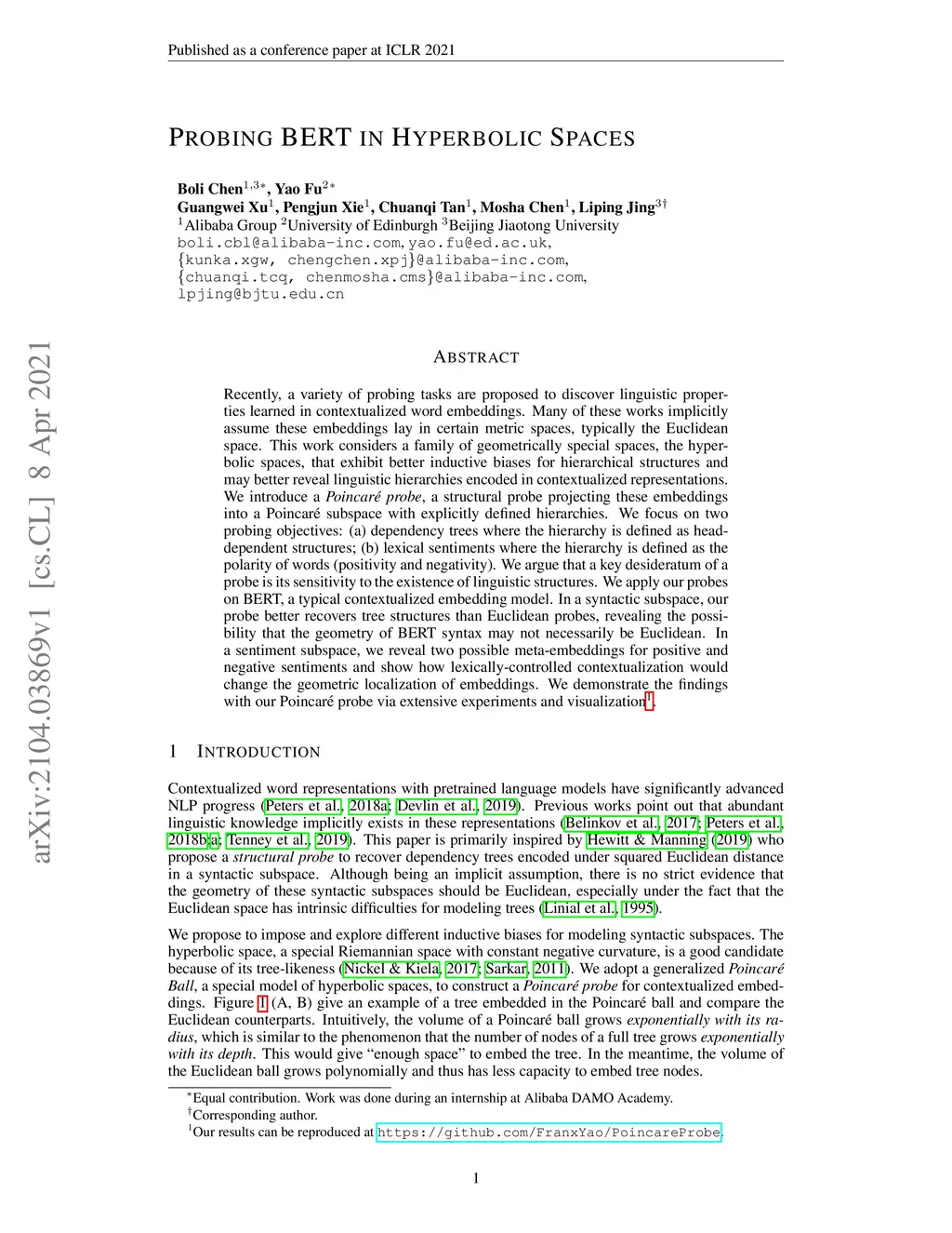 Recently, a variety of probing tasks are proposed to discover linguistic properties learned in contextualized word embeddings. Many of these works implicitly assume these embeddings lay in certain metric spaces, typically the Euclidean space. This work considers a family of geometrically special spaces, the hyperbolic spaces, that exhibit better inductive biases for hierarchical structures and may better reveal linguistic hierarchies encoded in contextualized representations. We introduce a Poincare probe, a structural probe projecting these embeddings into a Poincare subspace with explicitly defined hierarchies. We focus on two probing objectives: (a) dependency trees where the hierarchy is defined as head-dependent structures; (b) lexical sentiments where the hierarchy is defined as the polarity of words (positivity and negativity). We argue that a key desideratum of a probe is its sensitivity to the existence of linguistic structures. We apply our probes on BERT, a typical contextualized embedding model. In a syntactic subspace, our probe better recovers tree structures than Euclidean probes, revealing the possibility that the geometry of BERT syntax may not necessarily be Euclidean. In a sentiment subspace, we reveal two possible meta-embeddings for positive and negative sentiments and show how lexically-controlled contextualization would change the geometric localization of embeddings. We demonstrate the findings with our Poincare probe via extensive experiments and visualization. Our results can be reproduced at https://github.com/FranxYao/PoincareProbe.