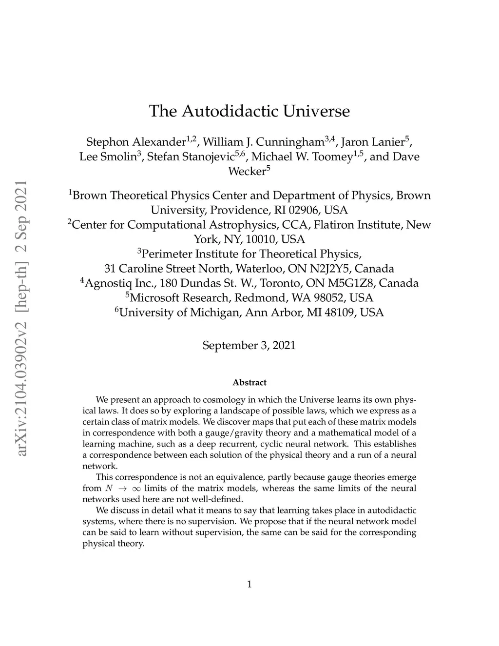 We present an approach to cosmology in which the Universe learns its own physical laws. It does so by exploring a landscape of possible laws, which we express as a certain class of matrix models. We discover maps that put each of these matrix models in correspondence with both a gauge/gravity theory and a mathematical model of a learning machine, such as a deep recurrent, cyclic neural network. This establishes a correspondence between each solution of the physical theory and a run of a neural network. This correspondence is not an equivalence, partly because gauge theories emerge from $N \rightarrow \infty $ limits of the matrix models, whereas the same limits of the neural networks used here are not well-defined. We discuss in detail what it means to say that learning takes place in autodidactic systems, where there is no supervision. We propose that if the neural network model can be said to learn without supervision, the same can be said for the corresponding physical theory. We consider other protocols for autodidactic physical systems, such as optimization of graph variety, subset-replication using self-attention and look-ahead, geometrogenesis guided by reinforcement learning, structural learning using renormalization group techniques, and extensions. These protocols together provide a number of directions in which to explore the origin of physical laws based on putting machine learning architectures in correspondence with physical theories.