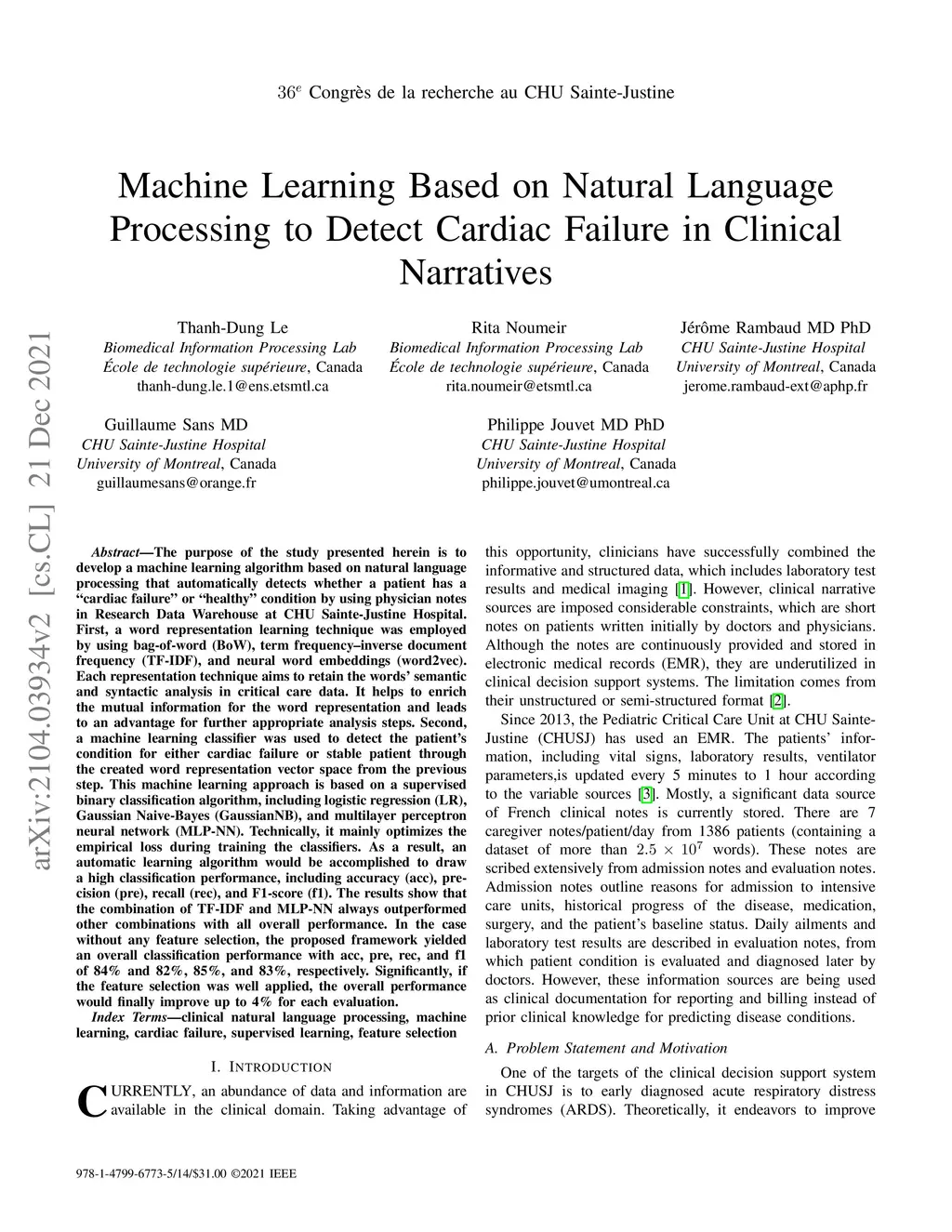 The purpose of the study presented herein is to develop a machine learning algorithm based on natural language processing that automatically detects whether a patient has a cardiac failure or a healthy condition by using physician notes in Research Data Warehouse at CHU Sainte Justine Hospital. First, a word representation learning technique was employed by using bag-of-word (BoW), term frequency inverse document frequency (TFIDF), and neural word embeddings (word2vec). Each representation technique aims to retain the words semantic and syntactic analysis in critical care data. It helps to enrich the mutual information for the word representation and leads to an advantage for further appropriate analysis steps. Second, a machine learning classifier was used to detect the patients condition for either cardiac failure or stable patient through the created word representation vector space from the previous step. This machine learning approach is based on a supervised binary classification algorithm, including logistic regression (LR), Gaussian Naive-Bayes (GaussianNB), and multilayer perceptron neural network (MLPNN). Technically, it mainly optimizes the empirical loss during training the classifiers. As a result, an automatic learning algorithm would be accomplished to draw a high classification performance, including accuracy (acc), precision (pre), recall (rec), and F1 score (f1). The results show that the combination of TFIDF and MLPNN always outperformed other combinations with all overall performance. In the case without any feature selection, the proposed framework yielded an overall classification performance with acc, pre, rec, and f1 of 84% and 82%, 85%, and 83%, respectively. Significantly, if the feature selection was well applied, the overall performance would finally improve up to 4% for each evaluation.