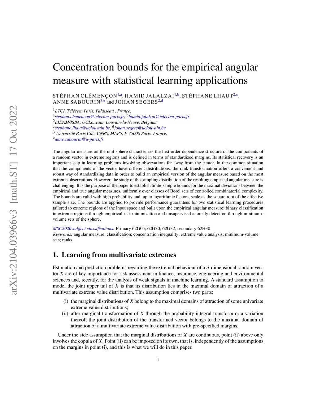 The angular measure on the unit sphere characterizes the first-order dependence structure of the components of a random vector in extreme regions and is defined in terms of standardized margins. Its statistical recovery is an important step in learning problems involving observations far away from the center. In the common situation that the components of the vector have different distributions, the rank transformation offers a convenient and robust way of standardizing data in order to build an empirical version of the angular measure based on the most extreme observations. However, the study of the sampling distribution of the resulting empirical angular measure is challenging. It is the purpose of the paper to establish finite-sample bounds for the maximal deviations between the empirical and true angular measures, uniformly over classes of Borel sets of controlled combinatorial complexity. The bounds are valid with high probability and, up to logarithmic factors, scale as the square root of the effective sample size. The bounds are applied to provide performance guarantees for two statistical learning procedures tailored to extreme regions of the input space and built upon the empirical angular measure: binary classification in extreme regions through empirical risk minimization and unsupervised anomaly detection through minimum-volume sets of the sphere.