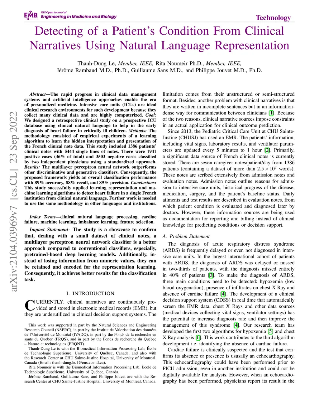 The rapid progress in clinical data management systems and artificial intelligence approaches enable the era of personalized medicine. Intensive care units (ICUs) are the ideal clinical research environment for such development because they collect many clinical data and are highly computerized environments. We designed a retrospective clinical study on a prospective ICU database using clinical natural language to help in the early diagnosis of heart failure in critically ill children. The methodology consisted of empirical experiments of a learning algorithm to learn the hidden interpretation and presentation of the French clinical note data. This study included 1386 patients' clinical notes with 5444 single lines of notes. There were 1941 positive cases (36 % of total) and 3503 negative cases classified by two independent physicians using a standardized approach. The multilayer perceptron neural network outperforms other discriminative and generative classifiers. Consequently, the proposed framework yields an overall classification performance with 89 % accuracy, 88 % recall, and 89 % precision. This study successfully applied learning representation and machine learning algorithms to detect heart failure from clinical natural language in a single French institution. Further work is needed to use the same methodology in other institutions and other languages.
