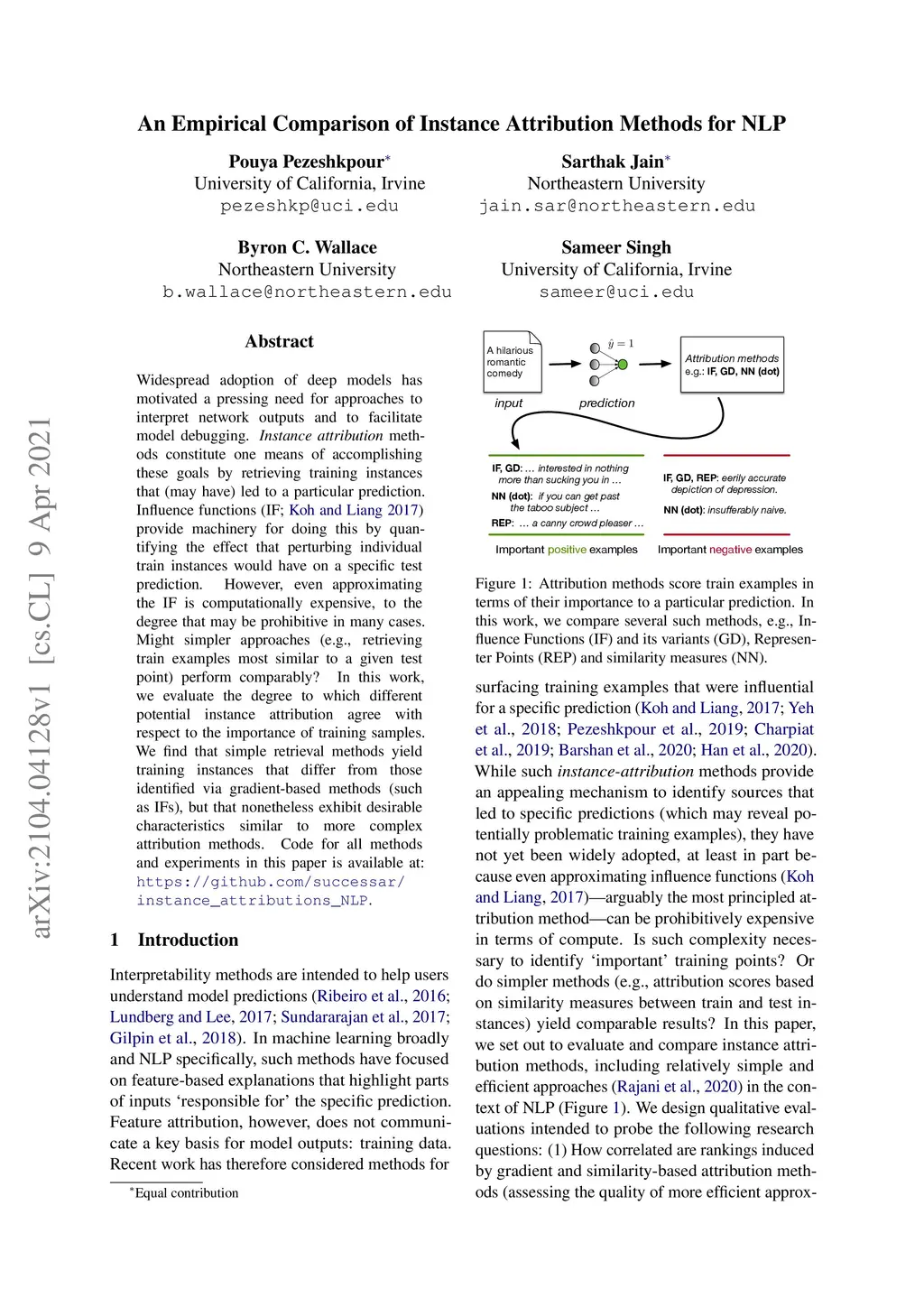 Widespread adoption of deep models has motivated a pressing need for approaches to interpret network outputs and to facilitate model debugging. Instance attribution methods constitute one means of accomplishing these goals by retrieving training instances that (may have) led to a particular prediction. Influence functions (IF; Koh and Liang 2017) provide machinery for doing this by quantifying the effect that perturbing individual train instances would have on a specific test prediction. However, even approximating the IF is computationally expensive, to the degree that may be prohibitive in many cases. Might simpler approaches (e.g., retrieving train examples most similar to a given test point) perform comparably? In this work, we evaluate the degree to which different potential instance attribution agree with respect to the importance of training samples. We find that simple retrieval methods yield training instances that differ from those identified via gradient-based methods (such as IFs), but that nonetheless exhibit desirable characteristics similar to more complex attribution methods. Code for all methods and experiments in this paper is available at: https://github.com/successar/instance_attributions_NLP.