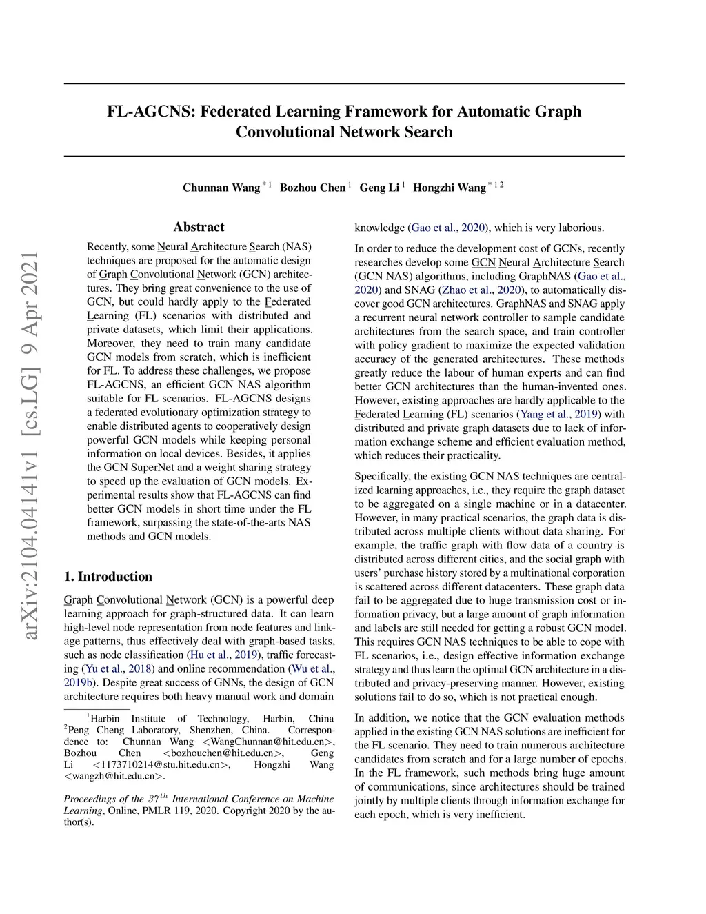 FL-AGCNS: Federated Learning Framework for Automatic Graph Convolutional