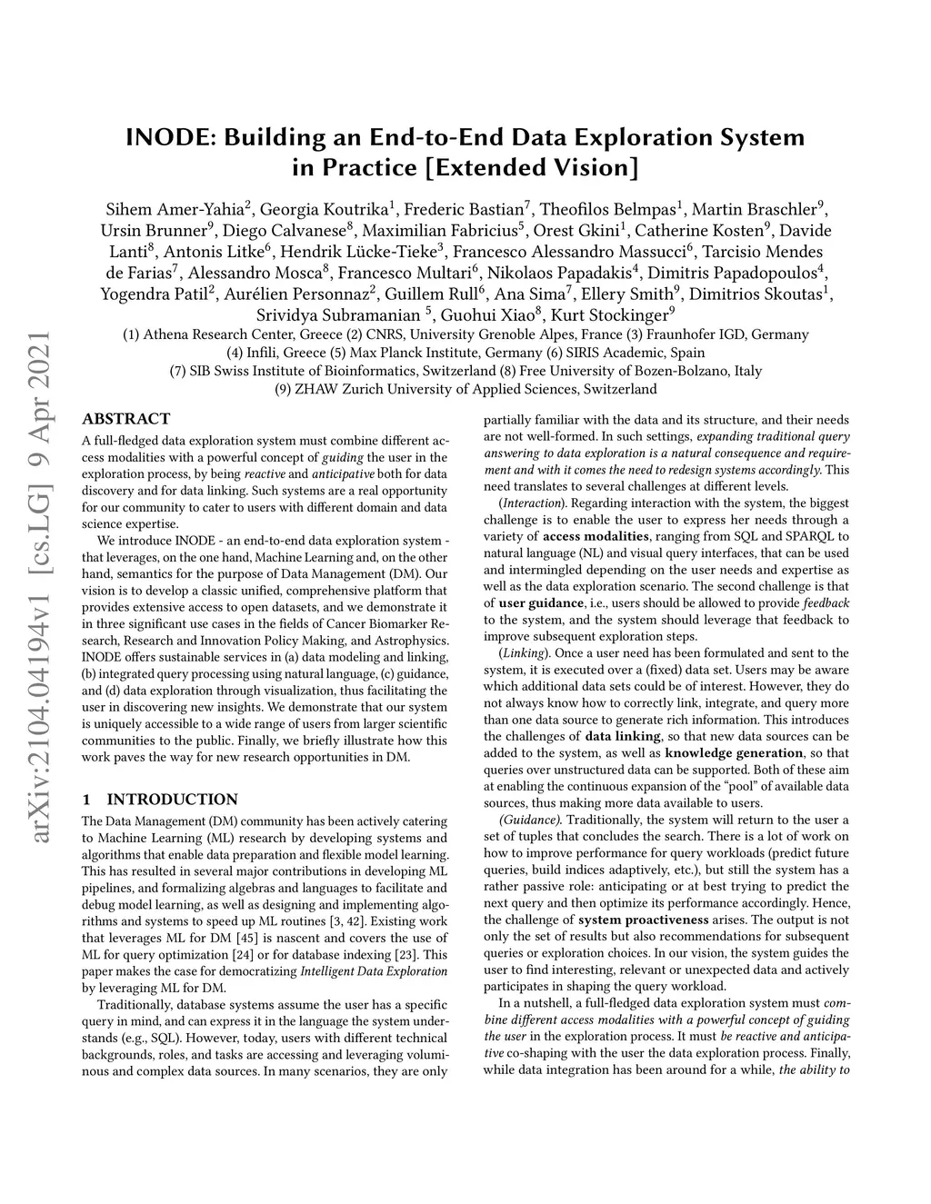 A full-fledged data exploration system must combine different access modalities with a powerful concept of guiding the user in the exploration process, by being reactive and anticipative both for data discovery and for data linking. Such systems are a real opportunity for our community to cater to users with different domain and data science expertise. We introduce INODE -- an end-to-end data exploration system -- that leverages, on the one hand, Machine Learning and, on the other hand, semantics for the purpose of Data Management (DM). Our vision is to develop a classic unified, comprehensive platform that provides extensive access to open datasets, and we demonstrate it in three significant use cases in the fields of Cancer Biomarker Reearch, Research and Innovation Policy Making, and Astrophysics. INODE offers sustainable services in (a) data modeling and linking, (b) integrated query processing using natural language, (c) guidance, and (d) data exploration through visualization, thus facilitating the user in discovering new insights. We demonstrate that our system is uniquely accessible to a wide range of users from larger scientific communities to the public. Finally, we briefly illustrate how this work paves the way for new research opportunities in DM.