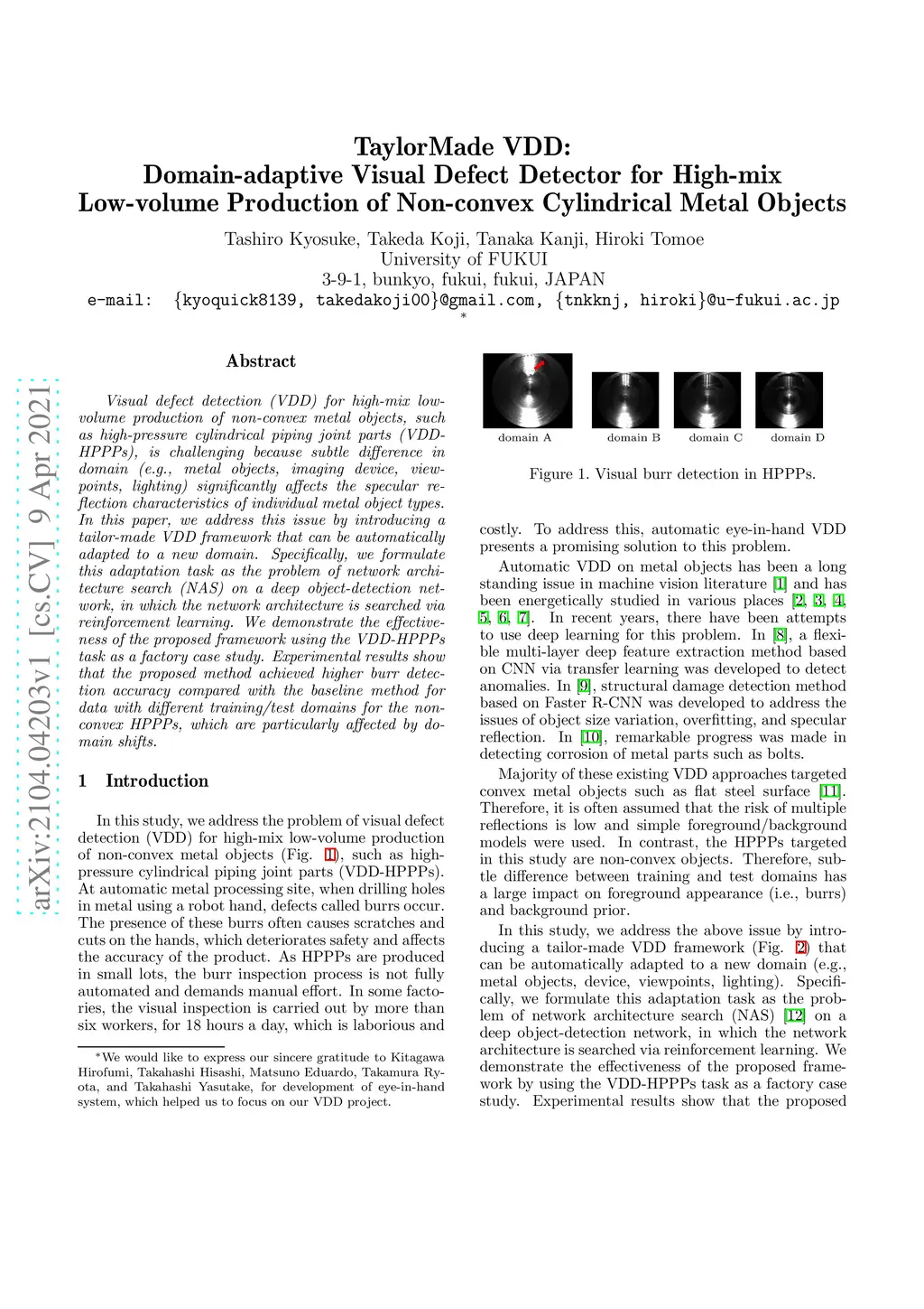 Visual defect detection (VDD) for high-mix low-volume production of non-convex metal objects, such as high-pressure cylindrical piping joint parts (VDD-HPPPs), is challenging because subtle difference in domain (e.g., metal objects, imaging device, viewpoints, lighting) significantly affects the specular reflection characteristics of individual metal object types. In this paper, we address this issue by introducing a tailor-made VDD framework that can be automatically adapted to a new domain. Specifically, we formulate this adaptation task as the problem of network architecture search (NAS) on a deep object-detection network, in which the network architecture is searched via reinforcement learning. We demonstrate the effectiveness of the proposed framework using the VDD-HPPPs task as a factory case study. Experimental results show that the proposed method achieved higher burr detection accuracy compared with the baseline method for data with different training/test domains for the non-convex HPPPs, which are particularly affected by domain shifts.