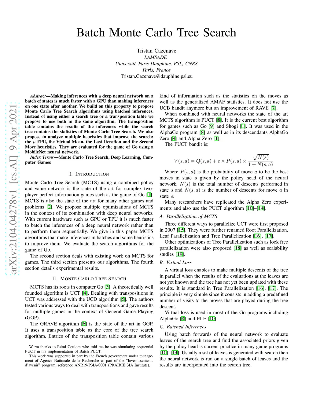 Making inferences with a deep neural network on a batch of states is much faster with a GPU than making inferences on one state after another. We build on this property to propose Monte Carlo Tree Search algorithms using batched inferences. Instead of using either a search tree or a transposition table we propose to use both in the same algorithm. The transposition table contains the results of the inferences while the search tree contains the statistics of Monte Carlo Tree Search. We also propose to analyze multiple heuristics that improve the search: the FPU, the Virtual Mean, the Last Iteration and the Second Move heuristics. They are evaluated for the game of Go using a MobileNet neural network.