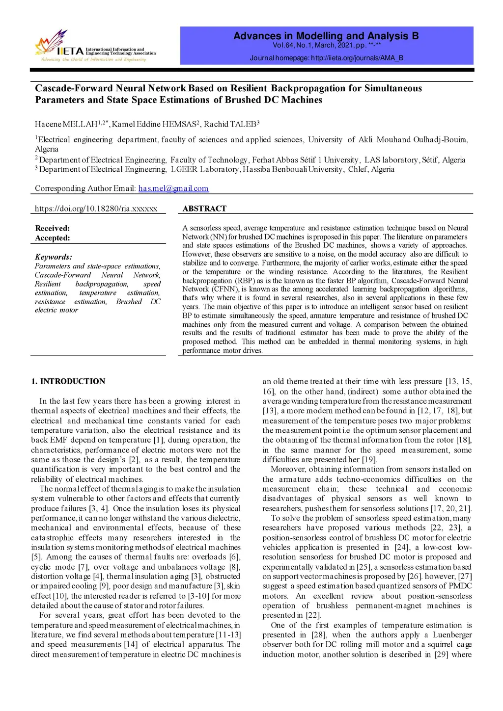 A sensorless speed, average temperature and resistance estimation technique based on Neural Network (NN) for brushed DC machines is proposed in this paper. The literature on parameters and state spaces estimations of the Brushed DC machines, shows a variety of approaches. However, these observers are sensitive to a noise, on the model accuracy also are difficult to stabilize and to converge. Furthermore, the majority of earlier works, estimate either the speed or the temperature or the winding resistance. According to the literatures, the Resilient backpropagation (RBP) as is the known as the faster BP algorithm, Cascade-Forward Neural Network (CFNN), is known as the among accelerated learning backpropagation algorithms, that's why where it is found in several researches, also in several applications in these few years. The main objective of this paper is to introduce an intelligent sensor based on resilient BP to estimate simultaneously the speed, armature temperature and resistance of brushed DC machines only from the measured current and voltage. A comparison between the obtained results and the results of traditional estimator has been made to prove the ability of the proposed method. This method can be embedded in thermal monitoring systems, in high performance motor drives.