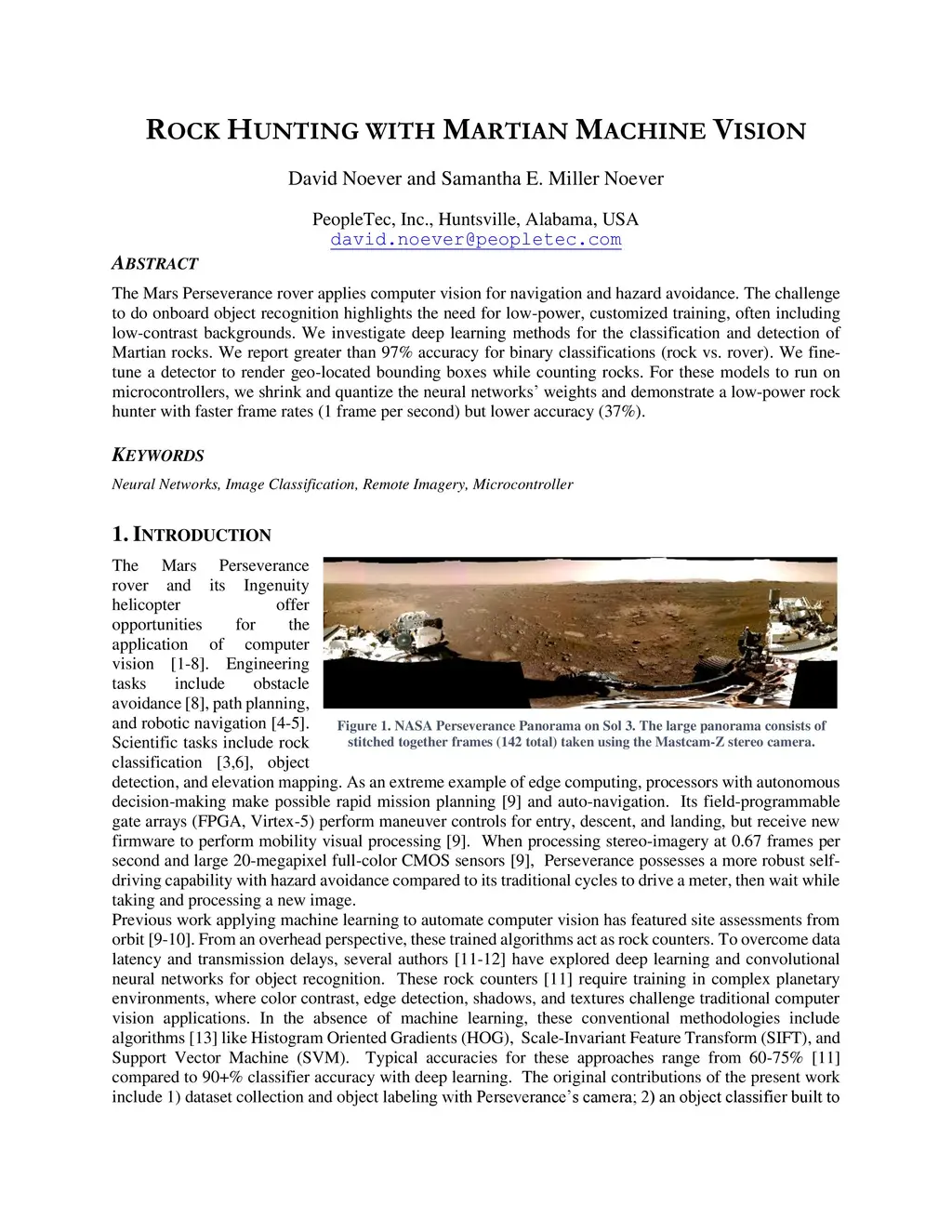The Mars Perseverance rover applies computer vision for navigation and hazard avoidance. The challenge to do onboard object recognition highlights the need for low-power, customized training, often including low-contrast backgrounds. We investigate deep learning methods for the classification and detection of Martian rocks. We report greater than 97% accuracy for binary classifications (rock vs. rover). We fine-tune a detector to render geo-located bounding boxes while counting rocks. For these models to run on microcontrollers, we shrink and quantize the neural networks' weights and demonstrate a low-power rock hunter with faster frame rates (1 frame per second) but lower accuracy (37%).