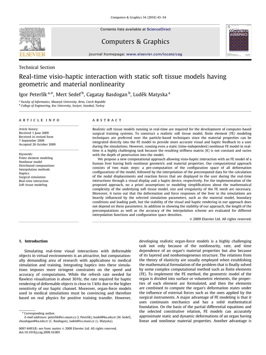 We propose a new approach allowing visio-haptic interaction with a FE model of a human liver having both non-linear geometric and material properties. The material properties used in the model are extracted from the experimental data of pig liver to make the simulations more realistic. Our computational approach consists of two main steps: a pre-computation of the configuration space of all possible deformation states of the model, followed by the interpolation of the precomputed data for the calculation of the reaction forces displayed to the user through a haptic device during the real-time interactions. No a priori assumptions or modeling simplifications about the mathematical complexity of the underlying soft tissue model, size and irregularity of the FE mesh are necessary. We show that deformation and force response of the liver in simulations are heavily influenced by the material model, boundary conditions, path of the loading and the type of function used for the interpolation of the pre-computed data.
