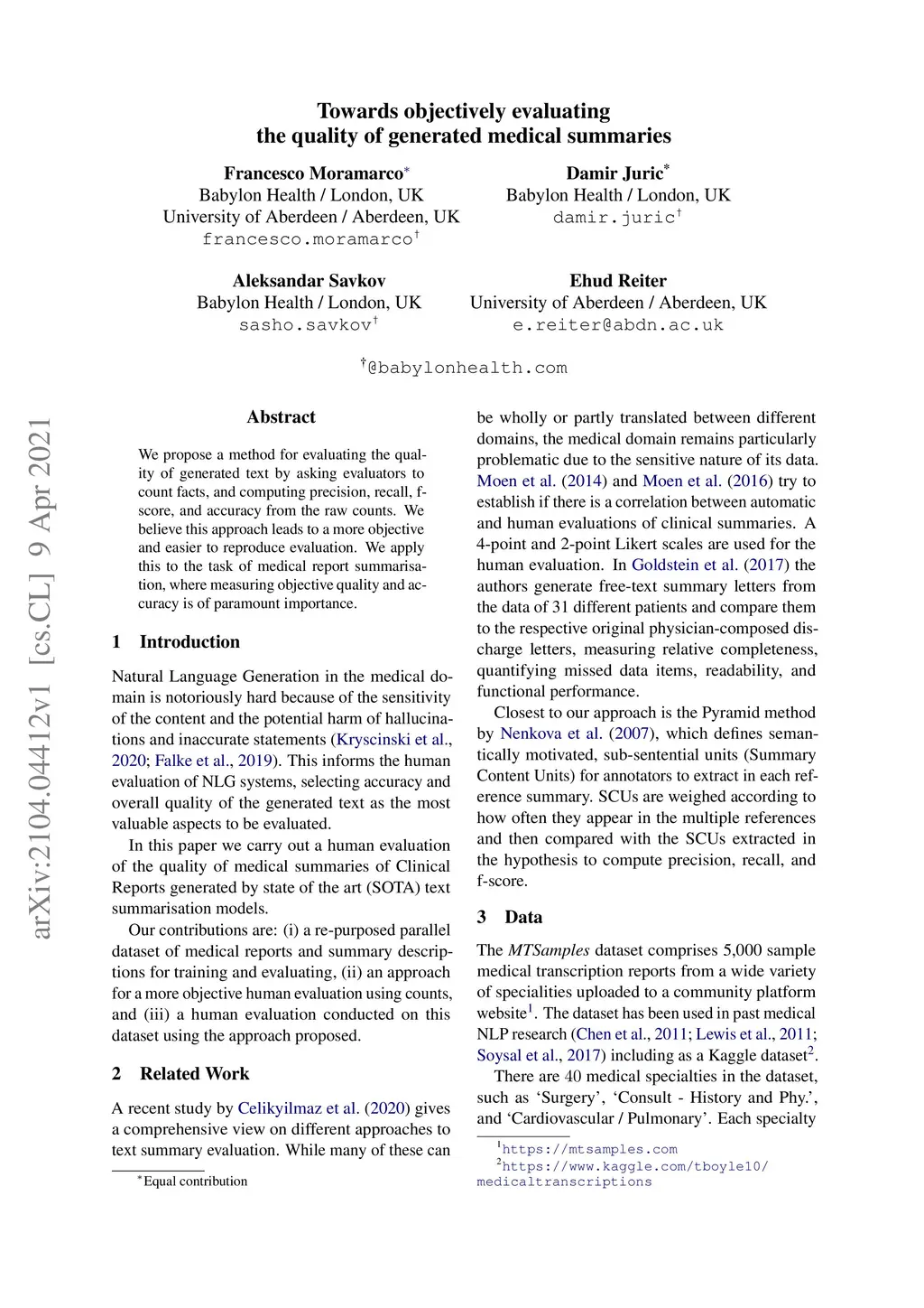 We propose a method for evaluating the quality of generated text by asking evaluators to count facts, and computing precision, recall, f-score, and accuracy from the raw counts. We believe this approach leads to a more objective and easier to reproduce evaluation. We apply this to the task of medical report summarisation, where measuring objective quality and accuracy is of paramount importance.