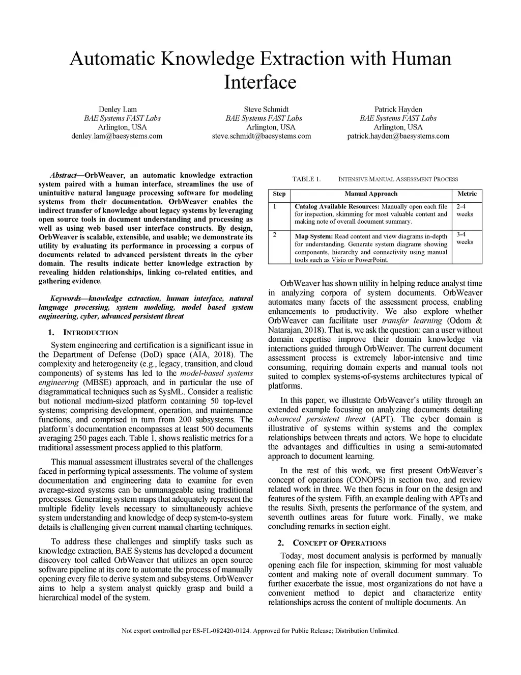 OrbWeaver, an automatic knowledge extraction system paired with a human interface, streamlines the use of unintuitive natural language processing software for modeling systems from their documentation. OrbWeaver enables the indirect transfer of knowledge about legacy systems by leveraging open source tools in document understanding and processing as well as using web based user interface constructs. By design, OrbWeaver is scalable, extensible, and usable; we demonstrate its utility by evaluating its performance in processing a corpus of documents related to advanced persistent threats in the cyber domain. The results indicate better knowledge extraction by revealing hidden relationships, linking co-related entities, and gathering evidence.