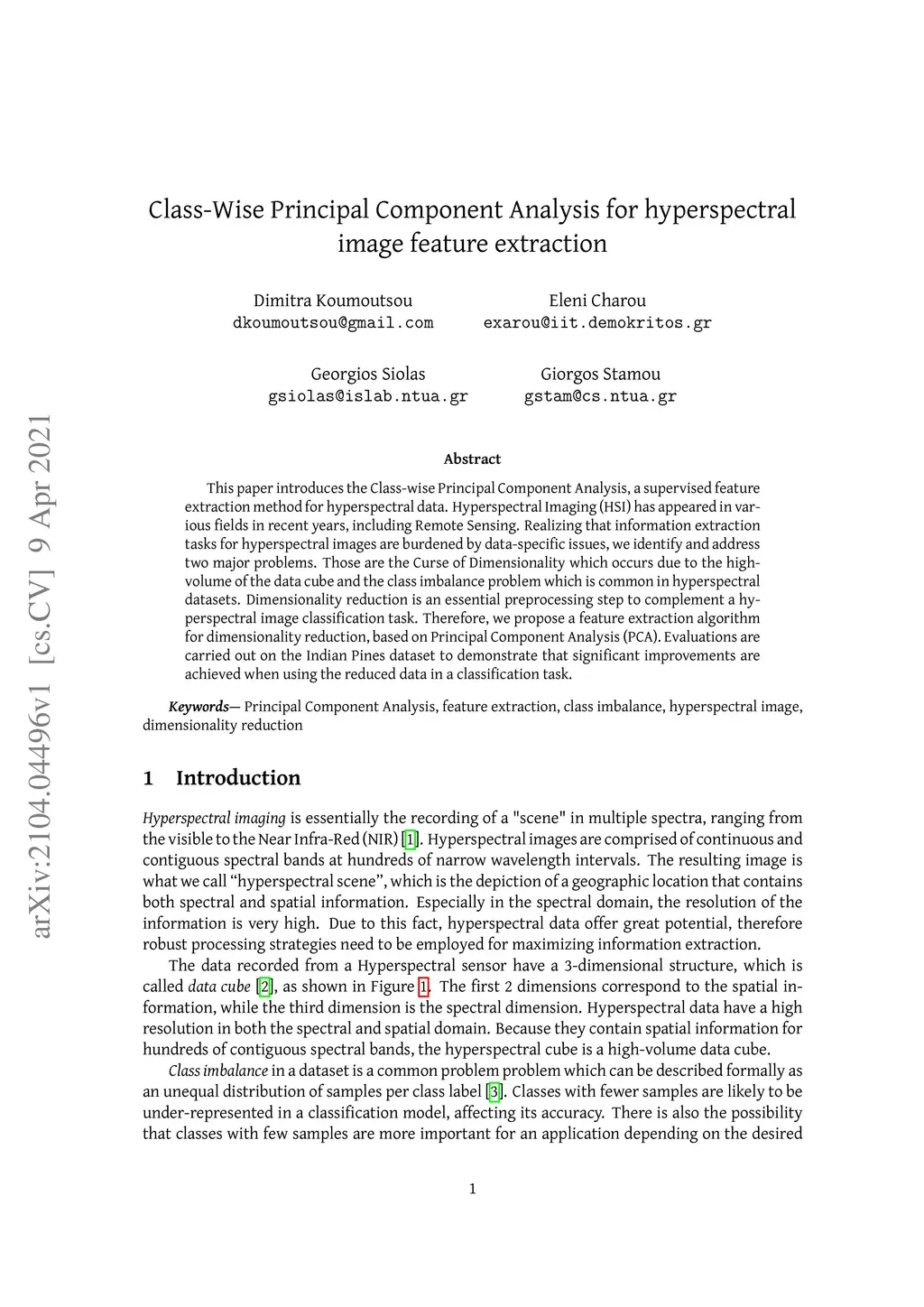 Class-Wise Principal Component Analysis for hyperspectral image feature