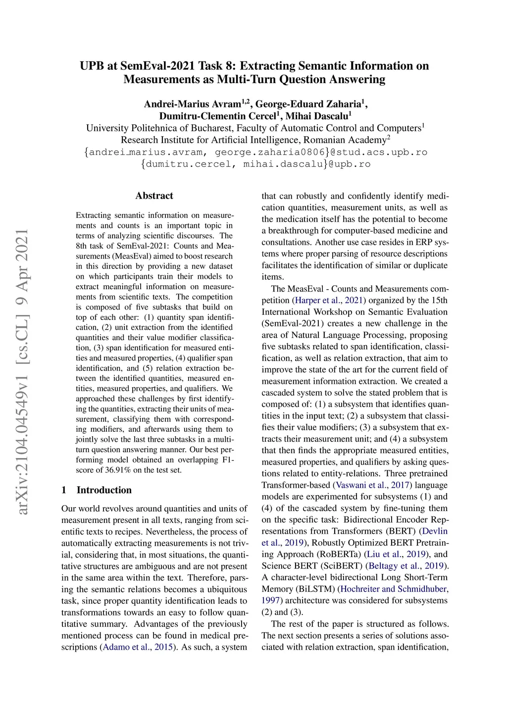 Extracting semantic information on measurements and counts is an important topic in terms of analyzing scientific discourses. The 8th task of SemEval-2021: Counts and Measurements (MeasEval) aimed to boost research in this direction by providing a new dataset on which participants train their models to extract meaningful information on measurements from scientific texts. The competition is composed of five subtasks that build on top of each other: (1) quantity span identification, (2) unit extraction from the identified quantities and their value modifier classification, (3) span identification for measured entities and measured properties, (4) qualifier span identification, and (5) relation extraction between the identified quantities, measured entities, measured properties, and qualifiers. We approached these challenges by first identifying the quantities, extracting their units of measurement, classifying them with corresponding modifiers, and afterwards using them to jointly solve the last three subtasks in a multi-turn question answering manner. Our best performing model obtained an overlapping F1-score of 36.91% on the test set.