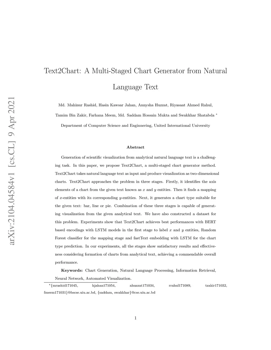 Generation of scientific visualization from analytical natural language text is a challenging task. In this paper, we propose Text2Chart, a multi-staged chart generator method. Text2Chart takes natural language text as input and produce visualization as two-dimensional charts. Text2Chart approaches the problem in three stages. Firstly, it identifies the axis elements of a chart from the given text known as x and y entities. Then it finds a mapping of x-entities with its corresponding y-entities. Next, it generates a chart type suitable for the given text: bar, line or pie. Combination of these three stages is capable of generating visualization from the given analytical text. We have also constructed a dataset for this problem. Experiments show that Text2Chart achieves best performances with BERT based encodings with LSTM models in the first stage to label x and y entities, Random Forest classifier for the mapping stage and fastText embedding with LSTM for the chart type prediction. In our experiments, all the stages show satisfactory results and effectiveness considering formation of charts from analytical text, achieving a commendable overall performance.