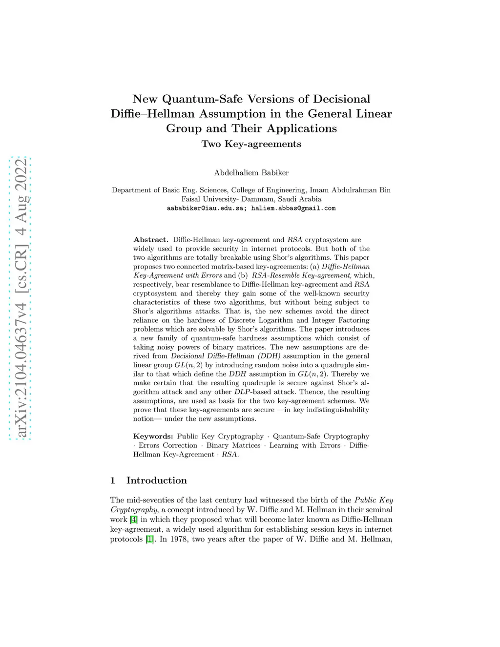 Diffie-Hellman key-agreement and RSA cryptosystem are widely used to provide security in internet protocols. But both of the two algorithms are totally breakable using Shor's algorithms. This paper proposes two connected matrix-based key-agreements: (a) Diffie-Hellman Key-Agreement with Errors and (b) RSA-Resemble Key-agreement, which, respectively, bear resemblance to Diffie-Hellman key-agreement and RSA cryptosystem and thereby they gain some of the well-known security characteristics of these two algorithms, but without being subject to Shor's algorithms attacks. That is, the new schemes avoid the direct reliance on the hardness of Discrete Logarithm and Integer Factoring problems which are solvable by Shor's algorithms. The paper introduces a new family of quantum-safe hardness assumptions which consist of taking noisy powers of binary matrices. The new assumptions are derived from Decisional Diffie-Hellman (DDH) assumption in the general linear group GL(n,2) by introducing random noise into a quadruple similar to that which define the DDH assumption in GL(n,2(. Thereby we make certain that the resulting quadruple is secure against Shor's algorithm attack and any other DLP-based attack. Thence, the resulting assumptions, are used as basis for the two key-agreement schemes. We prove that these key-agreements are secure -- in key indistinguishability notion -- under the new assumptions.