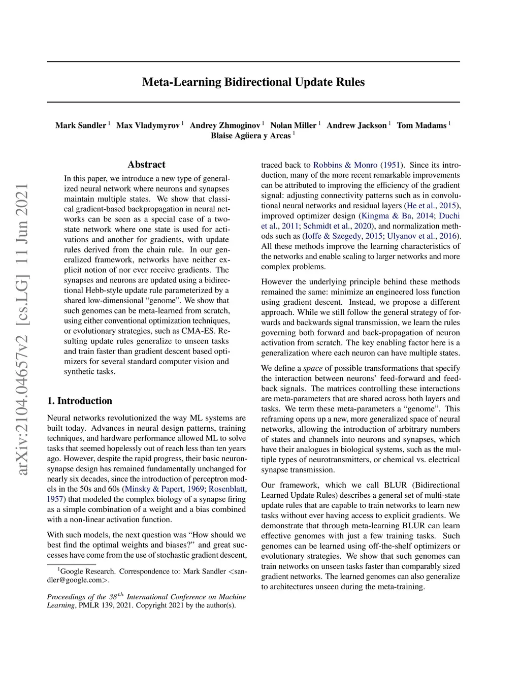 In this paper, we introduce a new type of generalized neural network where neurons and synapses maintain multiple states. We show that classical gradient-based backpropagation in neural networks can be seen as a special case of a two-state network where one state is used for activations and another for gradients, with update rules derived from the chain rule. In our generalized framework, networks have neither explicit notion of nor ever receive gradients. The synapses and neurons are updated using a bidirectional Hebb-style update rule parameterized by a shared low-dimensional "genome". We show that such genomes can be meta-learned from scratch, using either conventional optimization techniques, or evolutionary strategies, such as CMA-ES. Resulting update rules generalize to unseen tasks and train faster than gradient descent based optimizers for several standard computer vision and synthetic tasks.