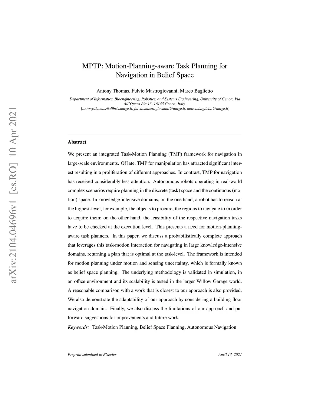 MPTP: Motion-Planning-aware Task Planning for Navigation in Belief Space