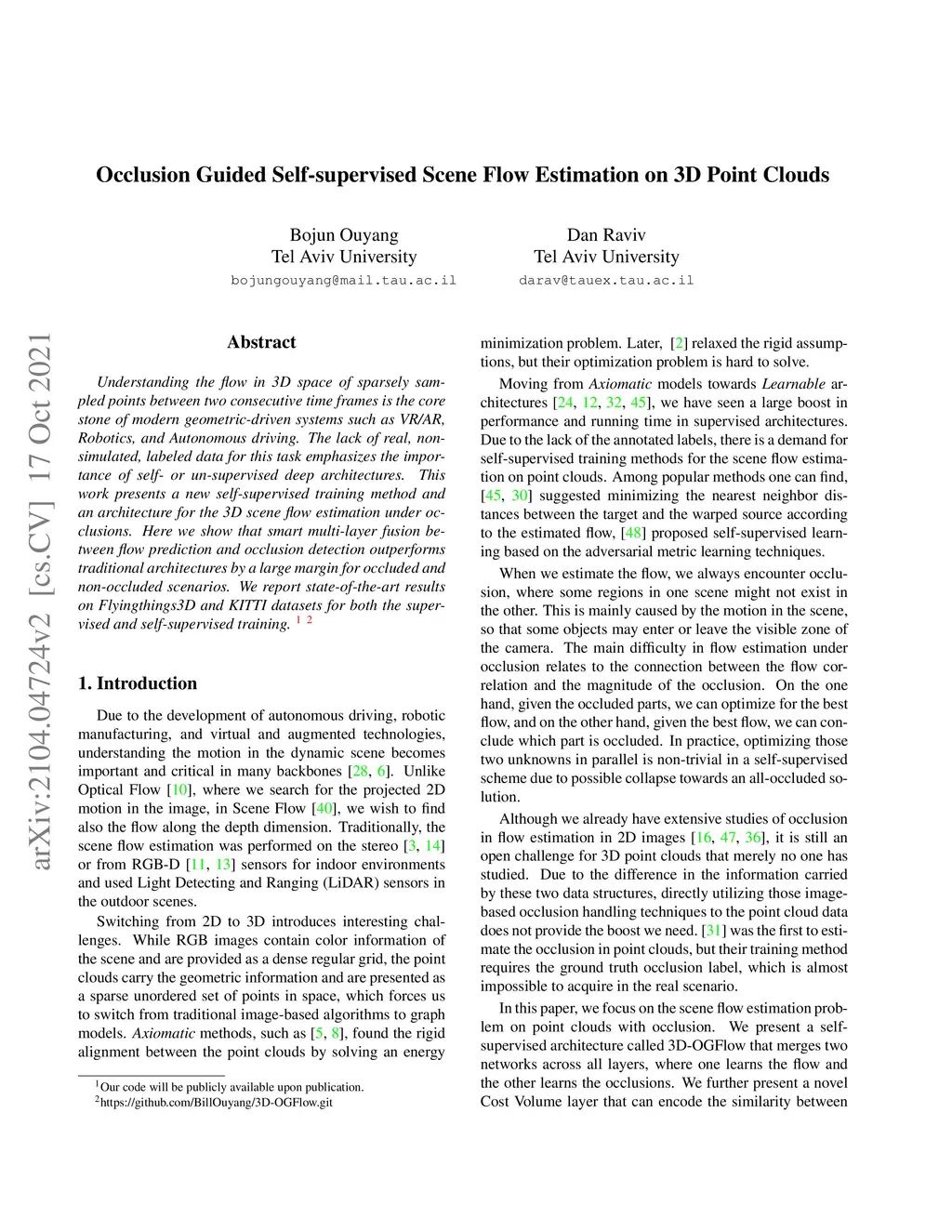 Understanding the flow in 3D space of sparsely sampled points between two consecutive time frames is the core stone of modern geometric-driven systems such as VR/AR, Robotics, and Autonomous driving. The lack of real, non-simulated, labeled data for this task emphasizes the importance of self- or un-supervised deep architectures. This work presents a new self-supervised training method and an architecture for the 3D scene flow estimation under occlusions. Here we show that smart multi-layer fusion between flow prediction and occlusion detection outperforms traditional architectures by a large margin for occluded and non-occluded scenarios. We report state-of-the-art results on Flyingthings3D and KITTI datasets for both the supervised and self-supervised training.