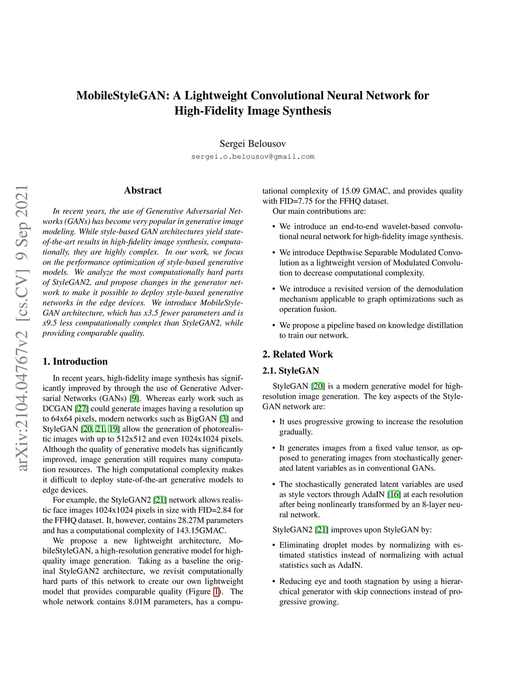 MobileStyleGAN: A Lightweight Convolutional Neural Network for