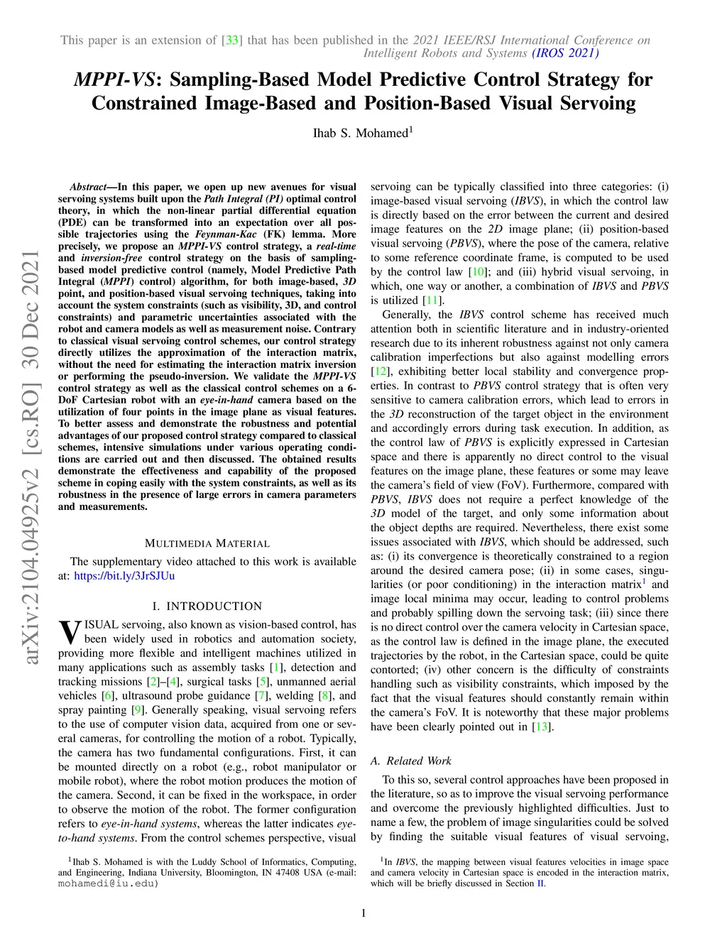 In this paper, we open up new avenues for visual servoing systems built upon the Path Integral (PI) optimal control theory, in which the non-linear partial differential equation (PDE) can be transformed into an expectation over all possible trajectories using the Feynman-Kac (FK) lemma. More precisely, we propose an MPPI-VS control strategy, a real-time and inversion-free control strategy on the basis of sampling-based model predictive control (namely, Model Predictive Path Integral (MPPI) control) algorithm, for both image-based, 3D point, and position-based visual servoing techniques, taking into account the system constraints (such as visibility, 3D, and control constraints) and parametric uncertainties associated with the robot and camera models as well as measurement noise. Contrary to classical visual servoing control schemes, our control strategy directly utilizes the approximation of the interaction matrix, without the need for estimating the interaction matrix inversion or performing the pseudo-inversion. We validate the MPPI-VS control strategy as well as the classical control schemes on a 6-DoF Cartesian robot with an eye-in-hand camera based on the utilization of four points in the image plane as visual features. To better assess and demonstrate the robustness and potential advantages of our proposed control strategy compared to classical schemes, intensive simulations under various operating conditions are carried out and then discussed. The obtained results demonstrate the effectiveness and capability of the proposed scheme in coping easily with the system constraints, as well as its robustness in the presence of large errors in camera parameters and measurements.