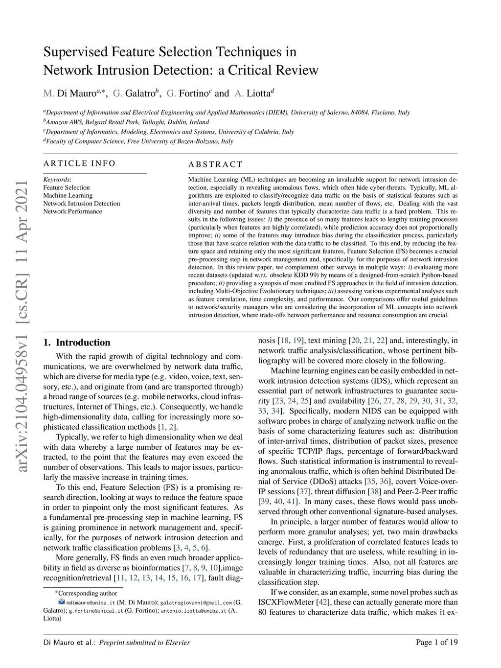 Machine Learning (ML) techniques are becoming an invaluable support for network intrusion detection, especially in revealing anomalous flows, which often hide cyber-threats. Typically, ML algorithms are exploited to classify/recognize data traffic on the basis of statistical features such as inter-arrival times, packets length distribution, mean number of flows, etc. Dealing with the vast diversity and number of features that typically characterize data traffic is a hard problem. This results in the following issues: i) the presence of so many features leads to lengthy training processes (particularly when features are highly correlated), while prediction accuracy does not proportionally improve; ii) some of the features may introduce bias during the classification process, particularly those that have scarce relation with the data traffic to be classified. To this end, by reducing the feature space and retaining only the most significant features, Feature Selection (FS) becomes a crucial pre-processing step in network management and, specifically, for the purposes of network intrusion detection. In this review paper, we complement other surveys in multiple ways: i) evaluating more recent datasets (updated w.r.t. obsolete KDD 99) by means of a designed-from-scratch Python-based procedure; ii) providing a synopsis of most credited FS approaches in the field of intrusion detection, including Multi-Objective Evolutionary techniques; iii) assessing various experimental analyses such as feature correlation, time complexity, and performance. Our comparisons offer useful guidelines to network/security managers who are considering the incorporation of ML concepts into network intrusion detection, where trade-offs between performance and resource consumption are crucial.