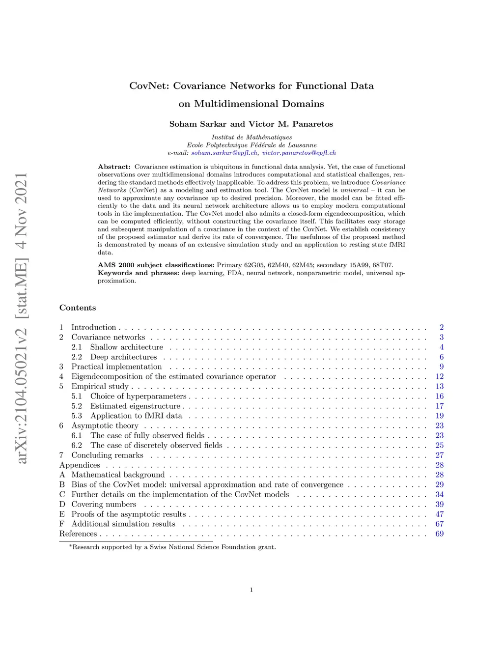 Covariance estimation is ubiquitous in functional data analysis. Yet, the case of functional observations over multidimensional domains introduces computational and statistical challenges, rendering the standard methods effectively inapplicable. To address this problem, we introduce "Covariance Networks" (CovNet) as a modeling and estimation tool. The CovNet model is "universal" - it can be used to approximate any covariance up to desired precision. Moreover, the model can be fitted efficiently to the data and its neural network architecture allows us to employ modern computational tools in the implementation. The CovNet model also admits a closed-form eigendecomposition, which can be computed efficiently, without constructing the covariance itself. This facilitates easy storage and subsequent manipulation of a covariance in the context of the CovNet. We establish consistency of the proposed estimator and derive its rate of convergence. The usefulness of the proposed method is demonstrated by means of an extensive simulation study and an application to resting state fMRI data.