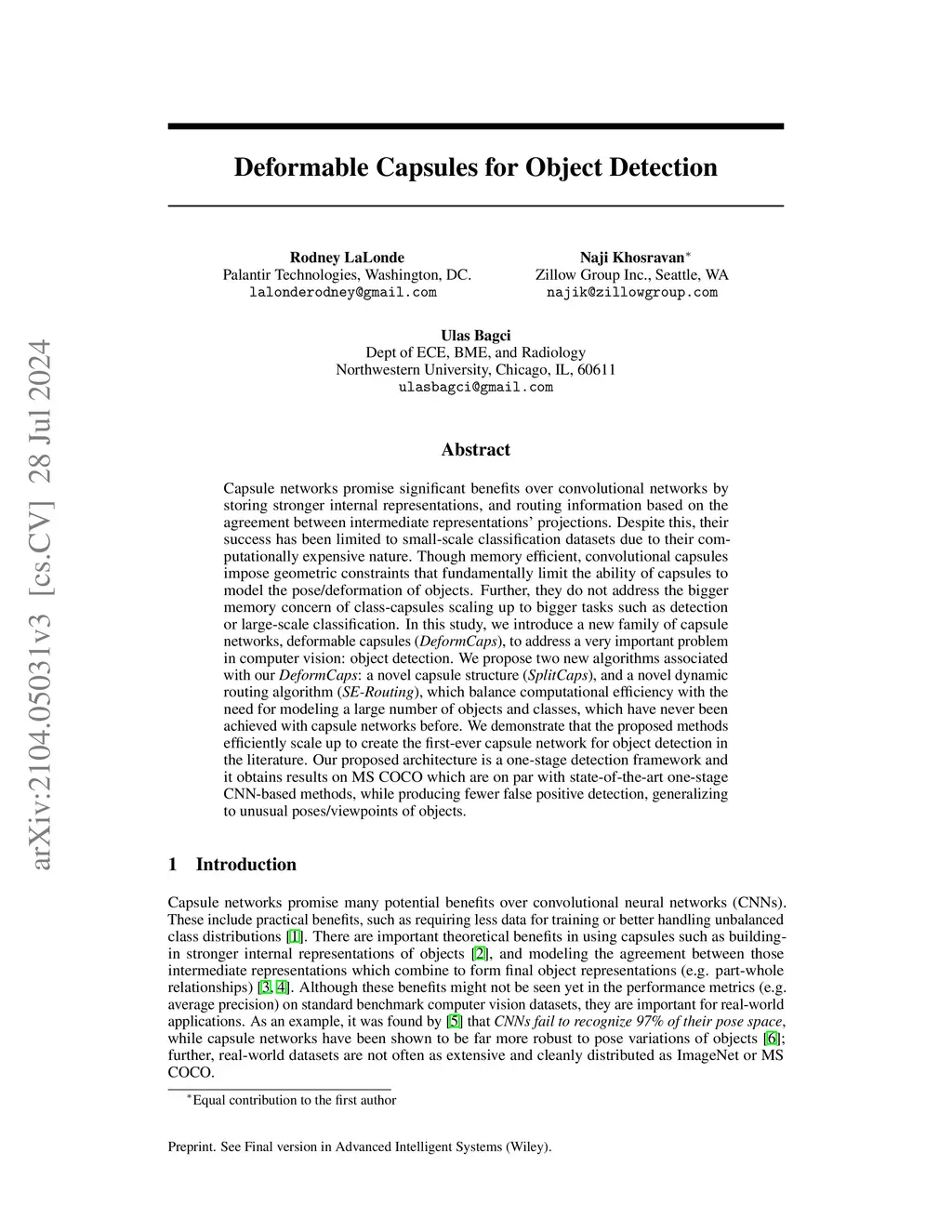 In this study, we introduce a new family of capsule networks, deformable capsules (DeformCaps), to address a very important problem in computer vision: object detection. We propose two new algorithms associated with our DeformCaps: a novel capsule structure (SplitCaps), and a novel dynamic routing algorithm (SE-Routing), which balance computational efficiency with the need for modeling a large number of objects and classes, which have never been achieved with capsule networks before. We demonstrate that the proposed methods allow capsules to efficiently scale-up to large-scale computer vision tasks for the first time, and create the first-ever capsule network for object detection in the literature. Our proposed architecture is a one-stage detection framework and obtains results on MS COCO which are on-par with state-of-the-art one-stage CNN-based methods, while producing fewer false positive detections, generalizing to unusual poses/viewpoints of objects.