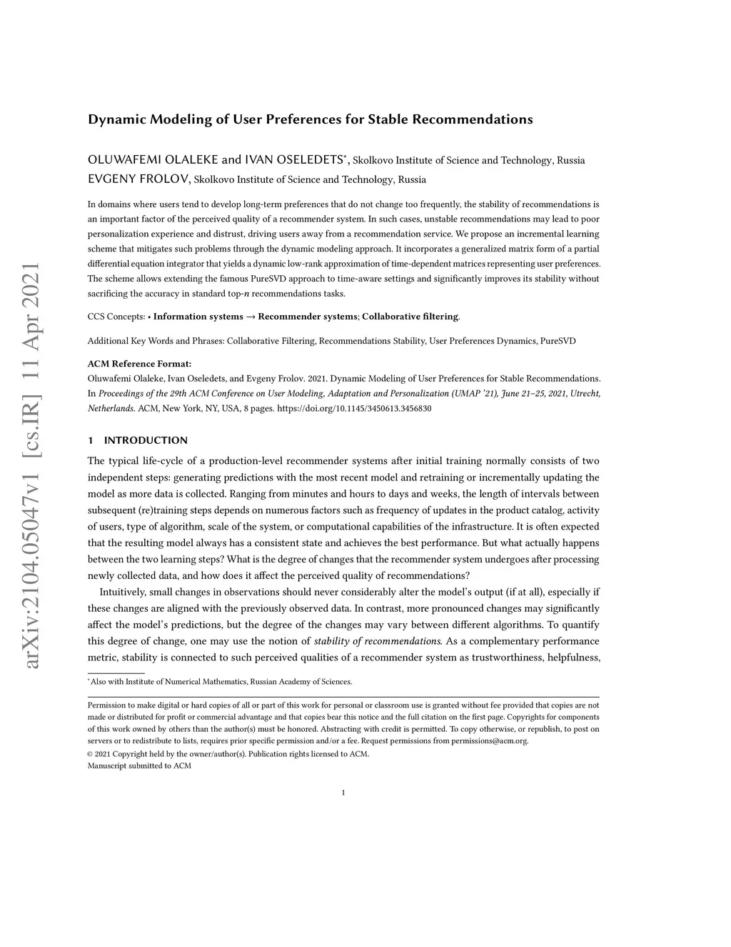 Dynamic Modeling of User Preferences for Stable Recommendations