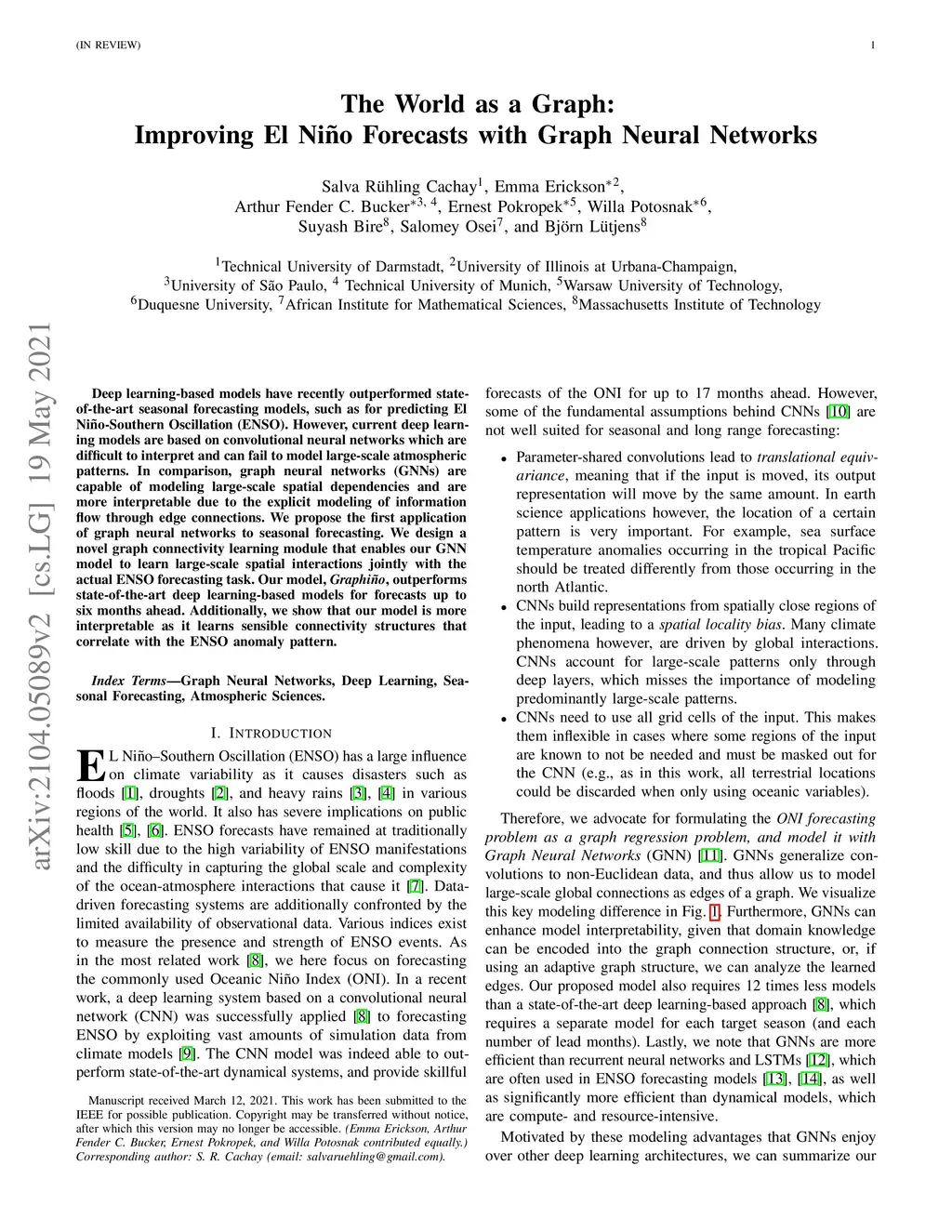 Deep learning-based models have recently outperformed state-of-the-art seasonal forecasting models, such as for predicting El Ni\~no-Southern Oscillation (ENSO). However, current deep learning models are based on convolutional neural networks which are difficult to interpret and can fail to model large-scale atmospheric patterns. In comparison, graph neural networks (GNNs) are capable of modeling large-scale spatial dependencies and are more interpretable due to the explicit modeling of information flow through edge connections. We propose the first application of graph neural networks to seasonal forecasting. We design a novel graph connectivity learning module that enables our GNN model to learn large-scale spatial interactions jointly with the actual ENSO forecasting task. Our model, \graphino, outperforms state-of-the-art deep learning-based models for forecasts up to six months ahead. Additionally, we show that our model is more interpretable as it learns sensible connectivity structures that correlate with the ENSO anomaly pattern.