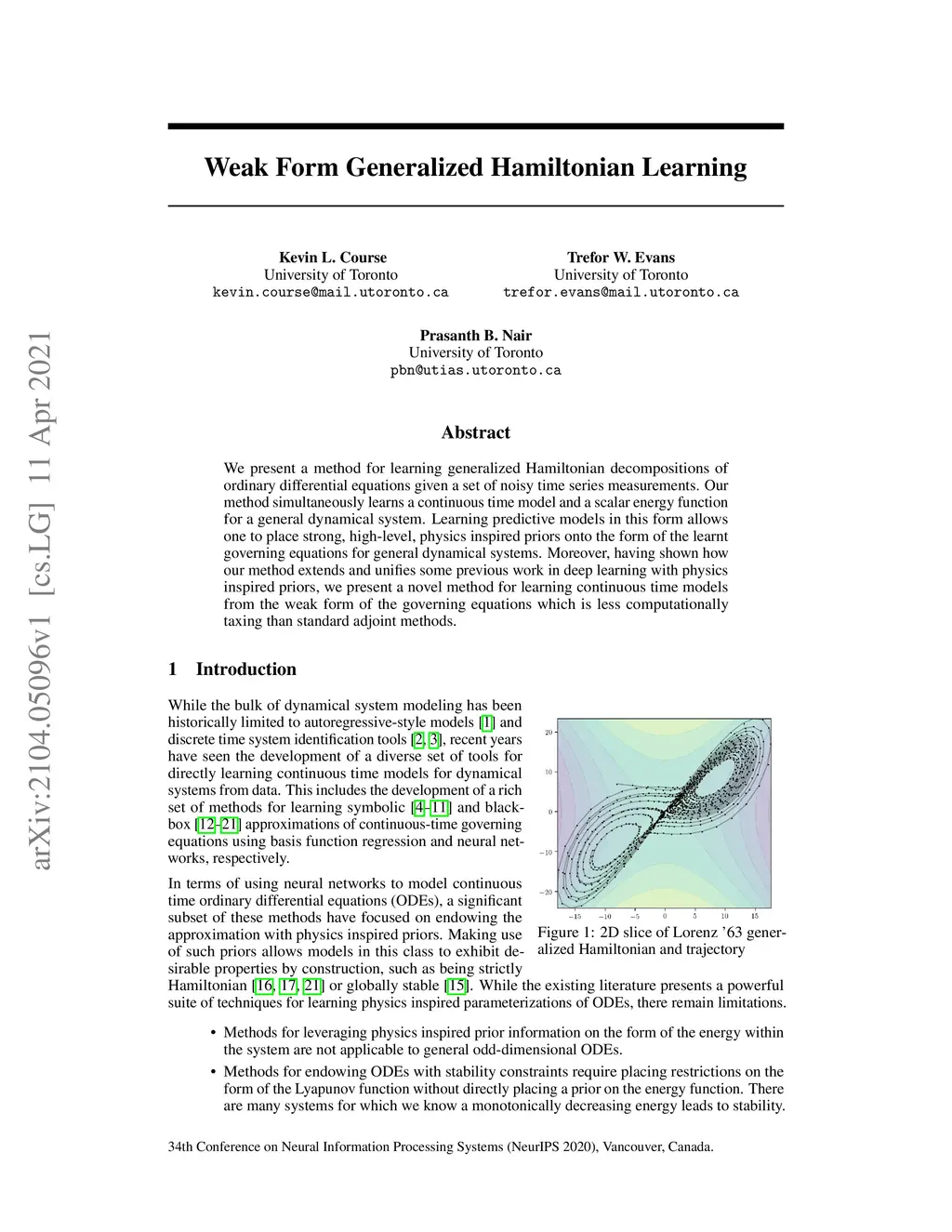 We present a method for learning generalized Hamiltonian decompositions of ordinary differential equations given a set of noisy time series measurements. Our method simultaneously learns a continuous time model and a scalar energy function for a general dynamical system. Learning predictive models in this form allows one to place strong, high-level, physics inspired priors onto the form of the learnt governing equations for general dynamical systems. Moreover, having shown how our method extends and unifies some previous work in deep learning with physics inspired priors, we present a novel method for learning continuous time models from the weak form of the governing equations which is less computationally taxing than standard adjoint methods.