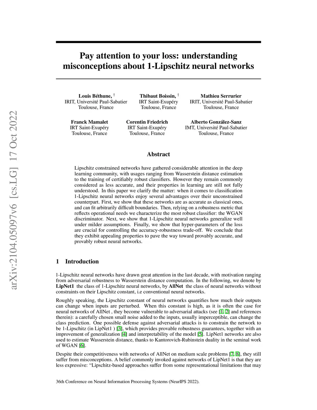 Lipschitz constrained networks have gathered considerable attention in the deep learning community, with usages ranging from Wasserstein distance estimation to the training of certifiably robust classifiers. However they remain commonly considered as less accurate, and their properties in learning are still not fully understood. In this paper we clarify the matter: when it comes to classification 1-Lipschitz neural networks enjoy several advantages over their unconstrained counterpart. First, we show that these networks are as accurate as classical ones, and can fit arbitrarily difficult boundaries. Then, relying on a robustness metric that reflects operational needs we characterize the most robust classifier: the WGAN discriminator. Next, we show that 1-Lipschitz neural networks generalize well under milder assumptions. Finally, we show that hyper-parameters of the loss are crucial for controlling the accuracy-robustness trade-off. We conclude that they exhibit appealing properties to pave the way toward provably accurate, and provably robust neural networks.