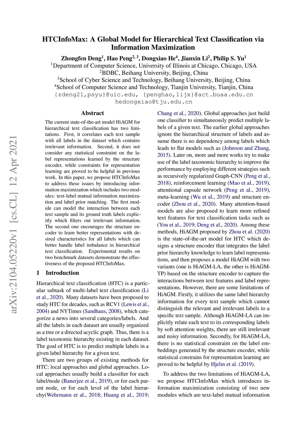 HTCInfoMax: A Global Model for Hierarchical Text Classification via