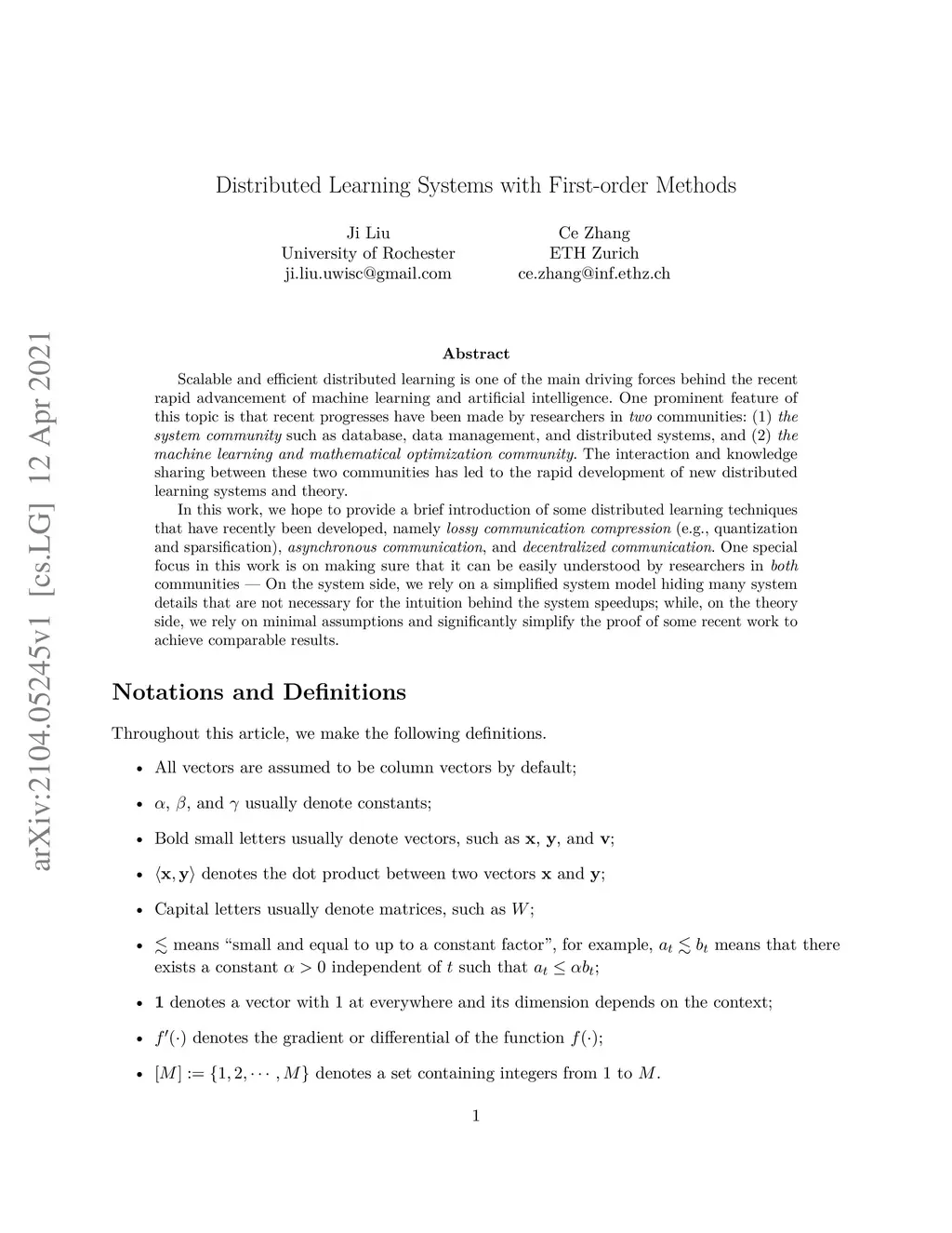 Scalable and efficient distributed learning is one of the main driving forces behind the recent rapid advancement of machine learning and artificial intelligence. One prominent feature of this topic is that recent progresses have been made by researchers in two communities: (1) the system community such as database, data management, and distributed systems, and (2) the machine learning and mathematical optimization community. The interaction and knowledge sharing between these two communities has led to the rapid development of new distributed learning systems and theory. In this work, we hope to provide a brief introduction of some distributed learning techniques that have recently been developed, namely lossy communication compression (e.g., quantization and sparsification), asynchronous communication, and decentralized communication. One special focus in this work is on making sure that it can be easily understood by researchers in both communities -- On the system side, we rely on a simplified system model hiding many system details that are not necessary for the intuition behind the system speedups; while, on the theory side, we rely on minimal assumptions and significantly simplify the proof of some recent work to achieve comparable results.