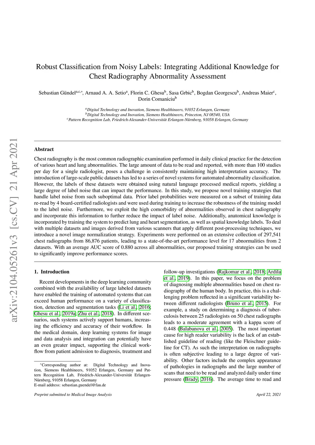 Chest radiography is the most common radiographic examination performed in daily clinical practice for the detection of various heart and lung abnormalities. The large amount of data to be read and reported, with more than 100 studies per day for a single radiologist, poses a challenge in consistently maintaining high interpretation accuracy. The introduction of large-scale public datasets has led to a series of novel systems for automated abnormality classification. However, the labels of these datasets were obtained using natural language processed medical reports, yielding a large degree of label noise that can impact the performance. In this study, we propose novel training strategies that handle label noise from such suboptimal data. Prior label probabilities were measured on a subset of training data re-read by 4 board-certified radiologists and were used during training to increase the robustness of the training model to the label noise. Furthermore, we exploit the high comorbidity of abnormalities observed in chest radiography and incorporate this information to further reduce the impact of label noise. Additionally, anatomical knowledge is incorporated by training the system to predict lung and heart segmentation, as well as spatial knowledge labels. To deal with multiple datasets and images derived from various scanners that apply different post-processing techniques, we introduce a novel image normalization strategy. Experiments were performed on an extensive collection of 297,541 chest radiographs from 86,876 patients, leading to a state-of-the-art performance level for 17 abnormalities from 2 datasets. With an average AUC score of 0.880 across all abnormalities, our proposed training strategies can be used to significantly improve performance scores.