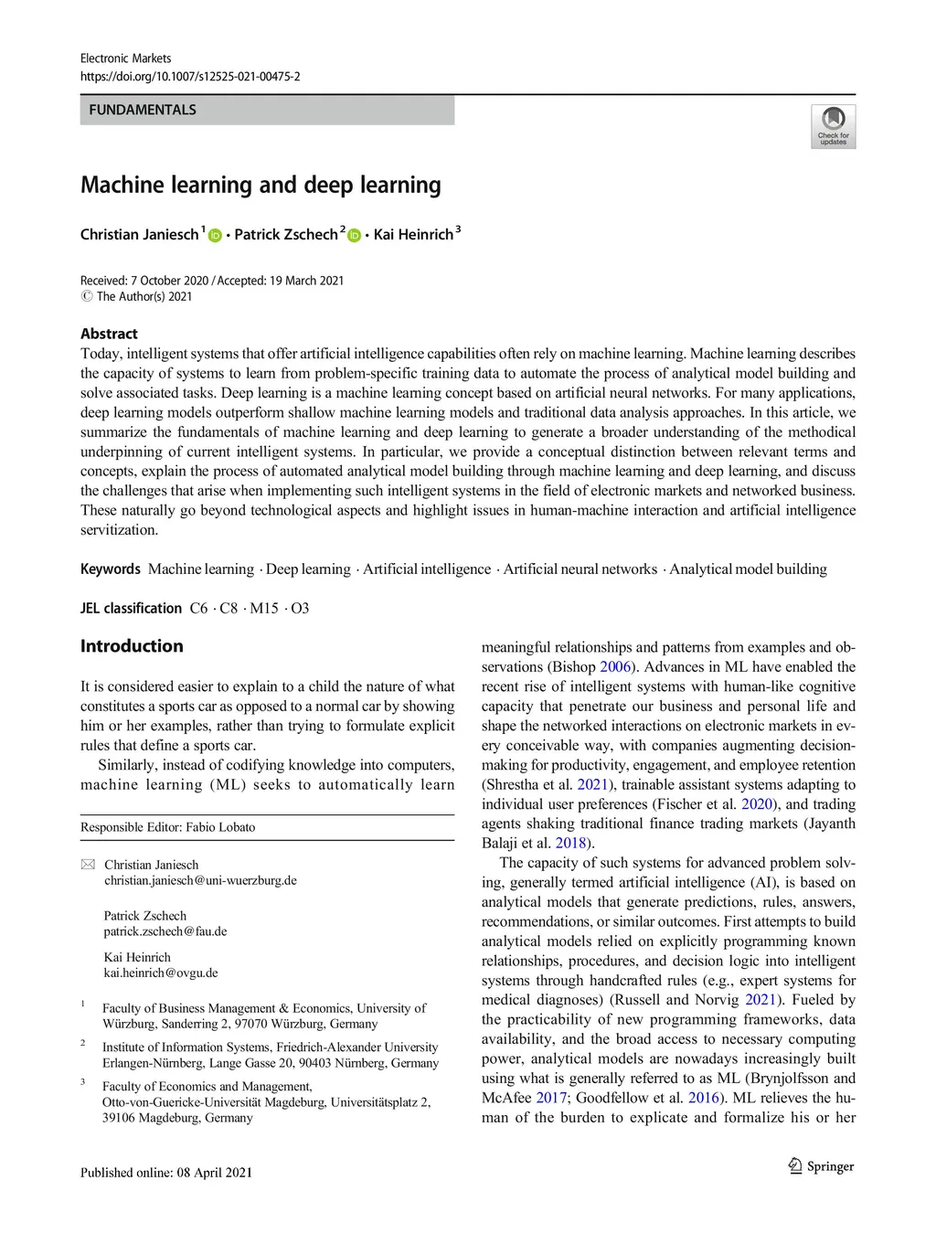 Today, intelligent systems that offer artificial intelligence capabilities often rely on machine learning. Machine learning describes the capacity of systems to learn from problem-specific training data to automate the process of analytical model building and solve associated tasks. Deep learning is a machine learning concept based on artificial neural networks. For many applications, deep learning models outperform shallow machine learning models and traditional data analysis approaches. In this article, we summarize the fundamentals of machine learning and deep learning to generate a broader understanding of the methodical underpinning of current intelligent systems. In particular, we provide a conceptual distinction between relevant terms and concepts, explain the process of automated analytical model building through machine learning and deep learning, and discuss the challenges that arise when implementing such intelligent systems in the field of electronic markets and networked business. These naturally go beyond technological aspects and highlight issues in human-machine interaction and artificial intelligence servitization.
