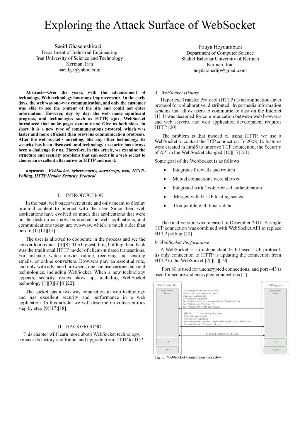 Over the years, with the advancement of technology, Web technology has many improvements. In the early days, the web was one-way communication, and only the customer was able to see the content of the site and could not enter information. However, day by day, the web made significant progress, and technologies such as HTTP, ajax, WebSocket introduced that make pages dynamic and Give us both sides. In short, it is a new type of communications protocol, which was faster and more efficient than previous communication protocols. After the web socket's unveiling, like any other technology, Its security has been discussed, and technology's security has always been a challenge for us. Therefore, in this article, we examine the structure and security problems that can occur in a web socket to choose an excellent alternative to HTTP and use it.