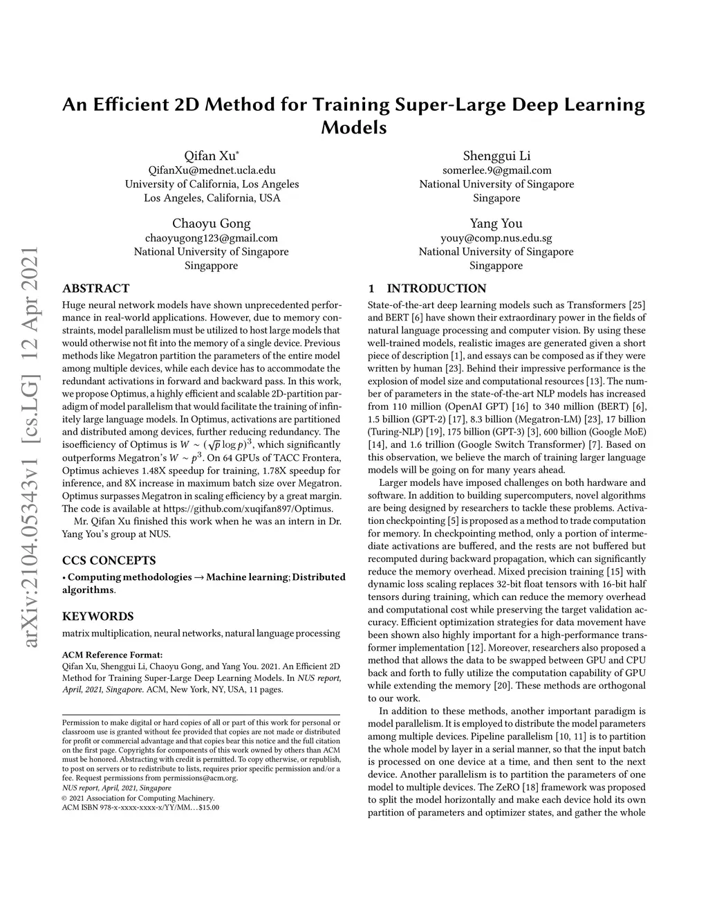 Huge neural network models have shown unprecedented performance in real-world applications. However, due to memory constraints, model parallelism must be utilized to host large models that would otherwise not fit into the memory of a single device. Previous methods like Megatron partition the parameters of the entire model among multiple devices, while each device has to accommodate the redundant activations in forward and backward pass. In this work, we propose Optimus, a highly efficient and scalable 2D-partition paradigm of model parallelism that would facilitate the training of infinitely large language models. In Optimus, activations are partitioned and distributed among devices, further reducing redundancy. In terms of isoefficiency, Optimus significantly outperforms Megatron. On 64 GPUs of TACC Frontera, Optimus achieves 1.48X speedup for training, 1.78X speedup for inference, and 8X increase in maximum batch size over Megatron. Optimus surpasses Megatron in scaling efficiency by a great margin. The code is available at https://github.com/xuqifan897/Optimus.