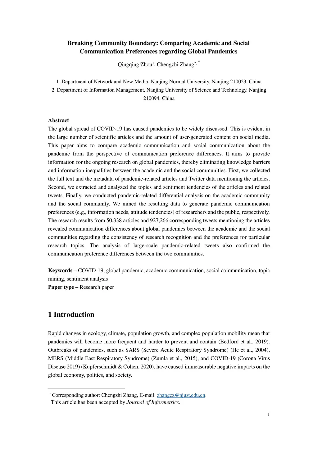 The global spread of COVID-19 has caused pandemics to be widely discussed. This is evident in the large number of scientific articles and the amount of user-generated content on social media. This paper aims to compare academic communication and social communication about the pandemic from the perspective of communication preference differences. It aims to provide information for the ongoing research on global pandemics, thereby eliminating knowledge barriers and information inequalities between the academic and the social communities. First, we collected the full text and the metadata of pandemic-related articles and Twitter data mentioning the articles. Second, we extracted and analyzed the topics and sentiment tendencies of the articles and related tweets. Finally, we conducted pandemic-related differential analysis on the academic community and the social community. We mined the resulting data to generate pandemic communication preferences (e.g., information needs, attitude tendencies) of researchers and the public, respectively. The research results from 50,338 articles and 927,266 corresponding tweets mentioning the articles revealed communication differences about global pandemics between the academic and the social communities regarding the consistency of research recognition and the preferences for particular research topics. The analysis of large-scale pandemic-related tweets also confirmed the communication preference differences between the two communities.