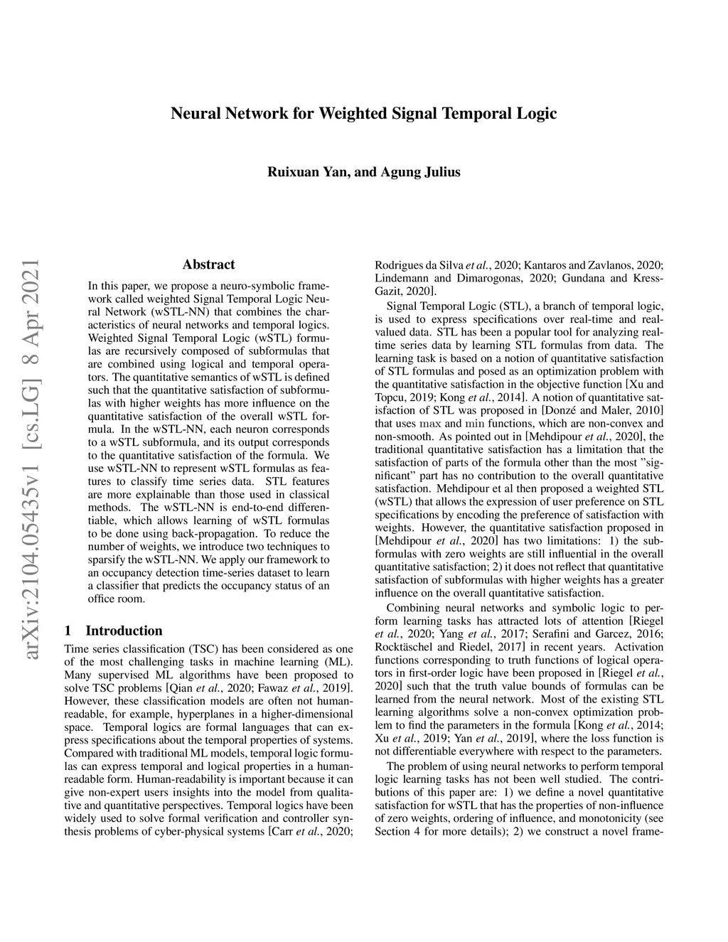 In this paper, we propose a neuro-symbolic framework called weighted Signal Temporal Logic Neural Network (wSTL-NN) that combines the characteristics of neural networks and temporal logics. Weighted Signal Temporal Logic (wSTL) formulas are recursively composed of subformulas that are combined using logical and temporal operators. The quantitative semantics of wSTL is defined such that the quantitative satisfaction of subformulas with higher weights has more influence on the quantitative satisfaction of the overall wSTL formula. In the wSTL-NN, each neuron corresponds to a wSTL subformula, and its output corresponds to the quantitative satisfaction of the formula. We use wSTL-NN to represent wSTL formulas as features to classify time series data. STL features are more explainable than those used in classical methods. The wSTL-NN is end-to-end differentiable, which allows learning of wSTL formulas to be done using back-propagation. To reduce the number of weights, we introduce two techniques to sparsify the wSTL-NN.We apply our framework to an occupancy detection time-series dataset to learn a classifier that predicts the occupancy status of an office room.