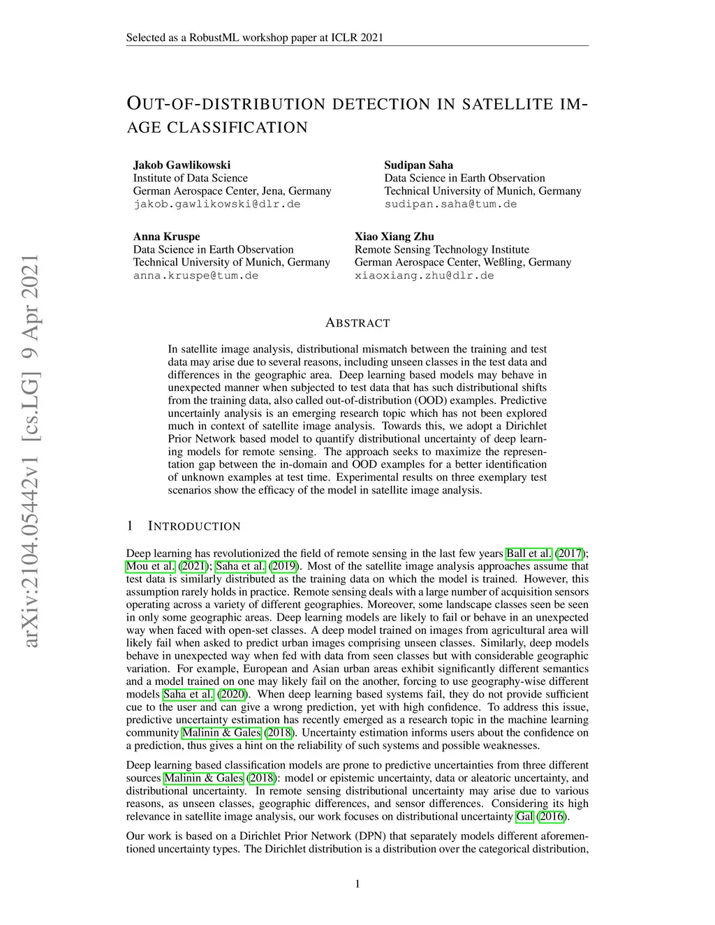 In satellite image analysis, distributional mismatch between the training and test data may arise due to several reasons, including unseen classes in the test data and differences in the geographic area. Deep learning based models may behave in unexpected manner when subjected to test data that has such distributional shifts from the training data, also called out-of-distribution (OOD) examples. Predictive uncertainly analysis is an emerging research topic which has not been explored much in context of satellite image analysis. Towards this, we adopt a Dirichlet Prior Network based model to quantify distributional uncertainty of deep learning models for remote sensing. The approach seeks to maximize the representation gap between the in-domain and OOD examples for a better identification of unknown examples at test time. Experimental results on three exemplary test scenarios show the efficacy of the model in satellite image analysis.