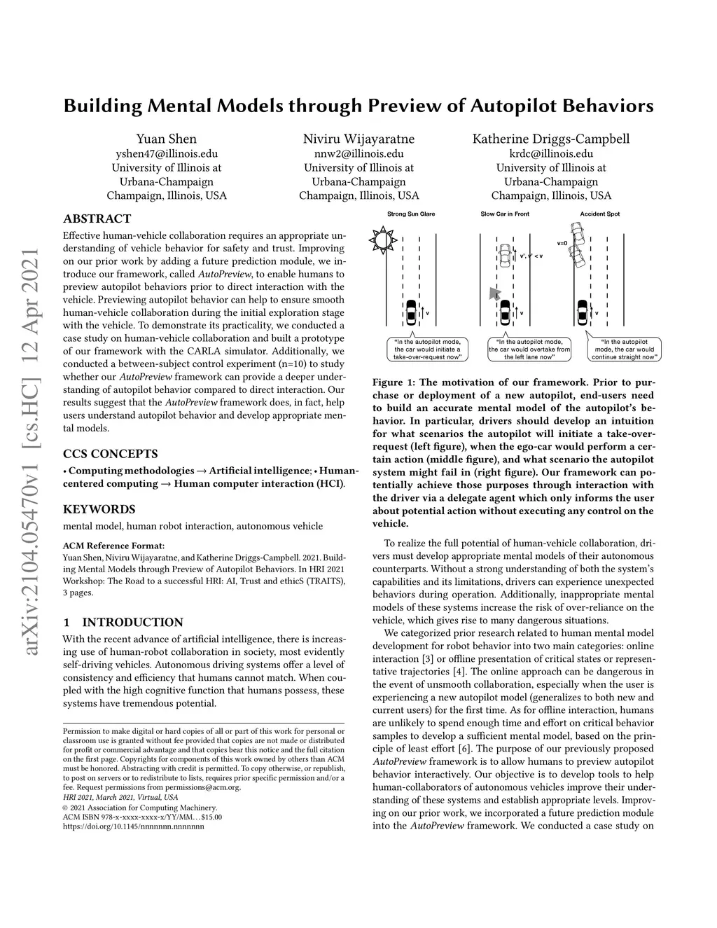 Effective human-vehicle collaboration requires an appropriate un-derstanding of vehicle behavior for safety and trust. Improvingon our prior work by adding a future prediction module, we in-troduce our framework, calledAutoPreview, to enable humans topreview autopilot behaviors prior to direct interaction with thevehicle. Previewing autopilot behavior can help to ensure smoothhuman-vehicle collaboration during the initial exploration stagewith the vehicle. To demonstrate its practicality, we conducted acase study on human-vehicle collaboration and built a prototypeof our framework with the CARLA simulator. Additionally, weconducted a between-subject control experiment (n=10) to studywhether ourAutoPreviewframework can provide a deeper under-standing of autopilot behavior compared to direct interaction. Ourresults suggest that theAutoPreviewframework does, in fact, helpusers understand autopilot behavior and develop appropriate men-tal models
