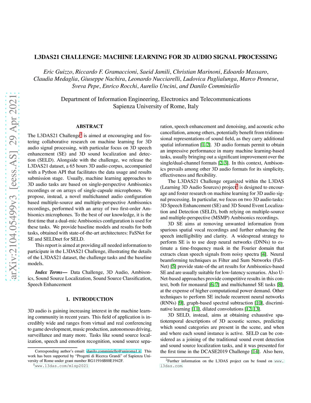 L3DAS21 Challenge: Machine Learning for 3D Audio Signal Processing