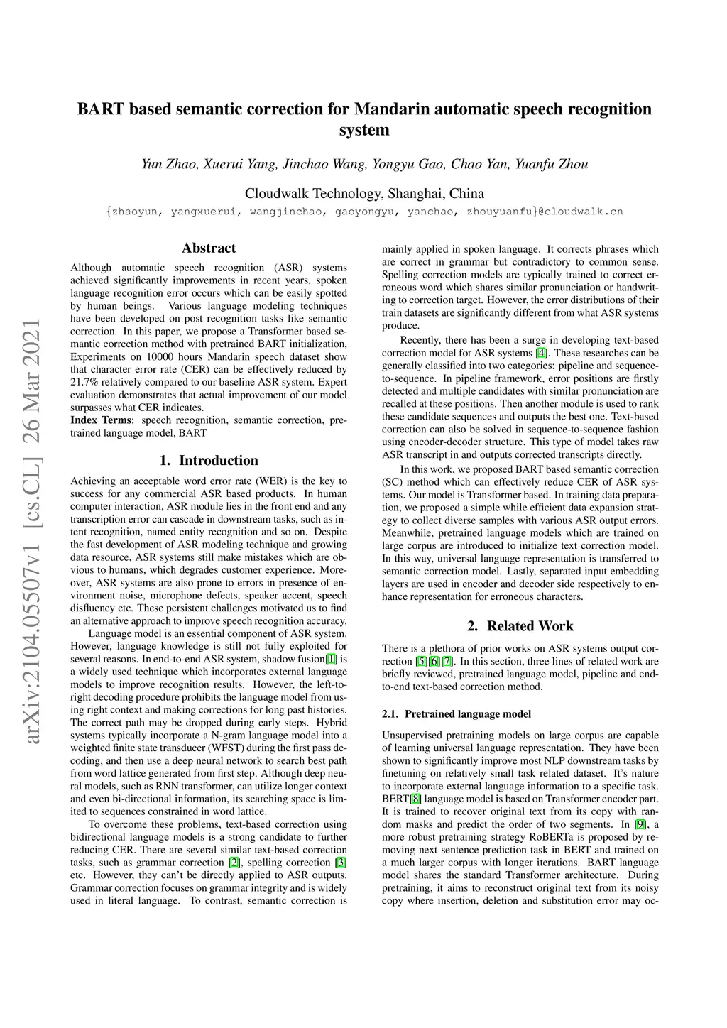 Although automatic speech recognition (ASR) systems achieved significantly improvements in recent years, spoken language recognition error occurs which can be easily spotted by human beings. Various language modeling techniques have been developed on post recognition tasks like semantic correction. In this paper, we propose a Transformer based semantic correction method with pretrained BART initialization, Experiments on 10000 hours Mandarin speech dataset show that character error rate (CER) can be effectively reduced by 21.7% relatively compared to our baseline ASR system. Expert evaluation demonstrates that actual improvement of our model surpasses what CER indicates.
