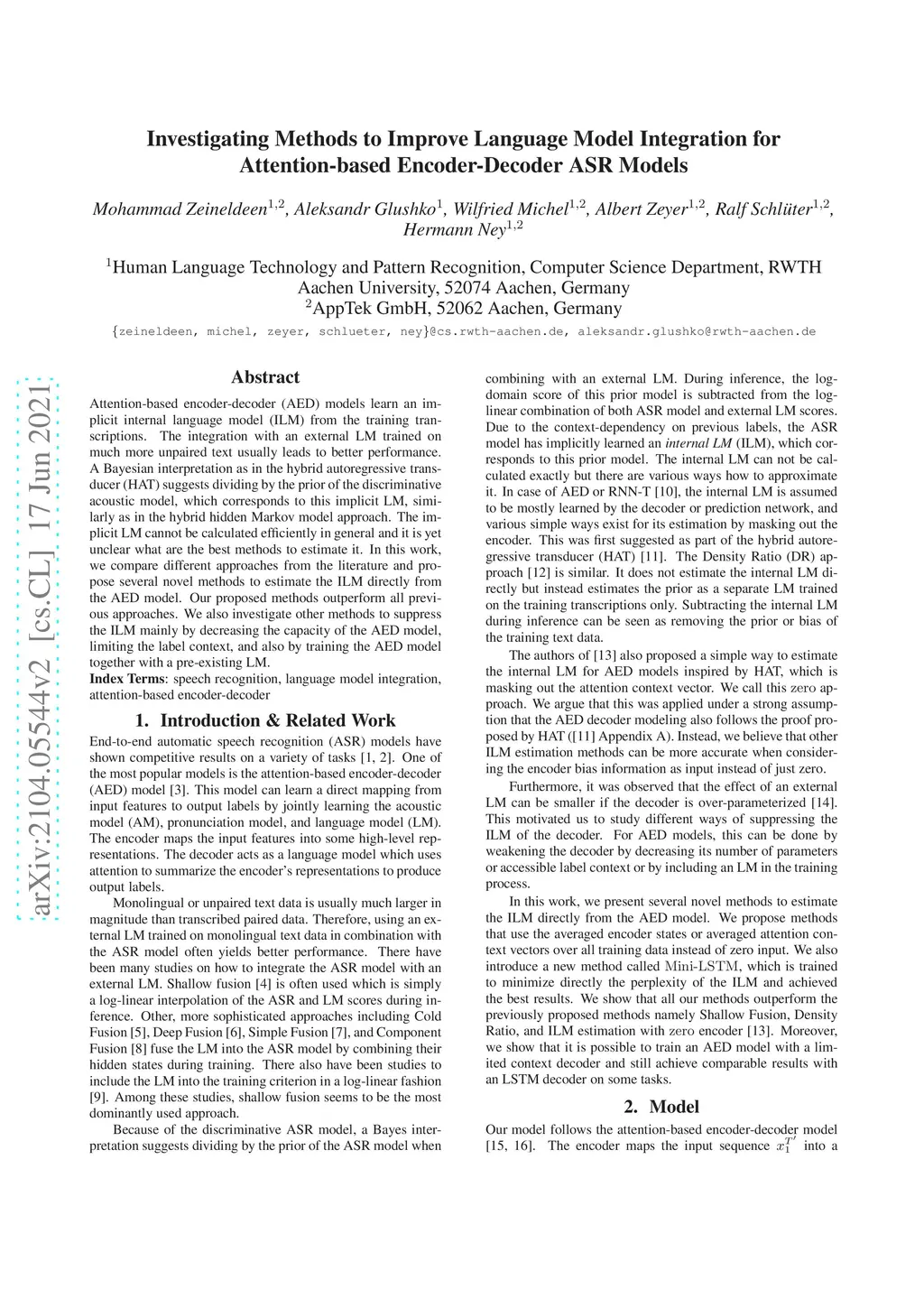 Attention-based encoder-decoder (AED) models learn an implicit internal language model (ILM) from the training transcriptions. The integration with an external LM trained on much more unpaired text usually leads to better performance. A Bayesian interpretation as in the hybrid autoregressive transducer (HAT) suggests dividing by the prior of the discriminative acoustic model, which corresponds to this implicit LM, similarly as in the hybrid hidden Markov model approach. The implicit LM cannot be calculated efficiently in general and it is yet unclear what are the best methods to estimate it. In this work, we compare different approaches from the literature and propose several novel methods to estimate the ILM directly from the AED model. Our proposed methods outperform all previous approaches. We also investigate other methods to suppress the ILM mainly by decreasing the capacity of the AED model, limiting the label context, and also by training the AED model together with a pre-existing LM.