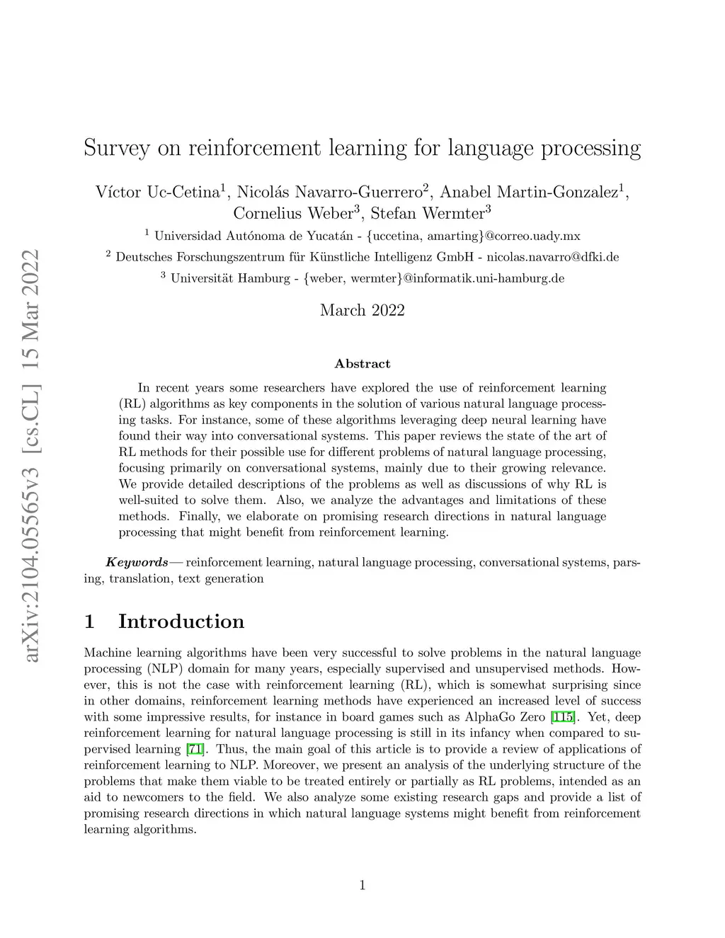 In recent years some researchers have explored the use of reinforcement learning (RL) algorithms as key components in the solution of various natural language processing tasks. For instance, some of these algorithms leveraging deep neural learning have found their way into conversational systems. This paper reviews the state of the art of RL methods for their possible use for different problems of natural language processing, focusing primarily on conversational systems, mainly due to their growing relevance. We provide detailed descriptions of the problems as well as discussions of why RL is well-suited to solve them. Also, we analyze the advantages and limitations of these methods. Finally, we elaborate on promising research directions in natural language processing that might benefit from reinforcement learning.